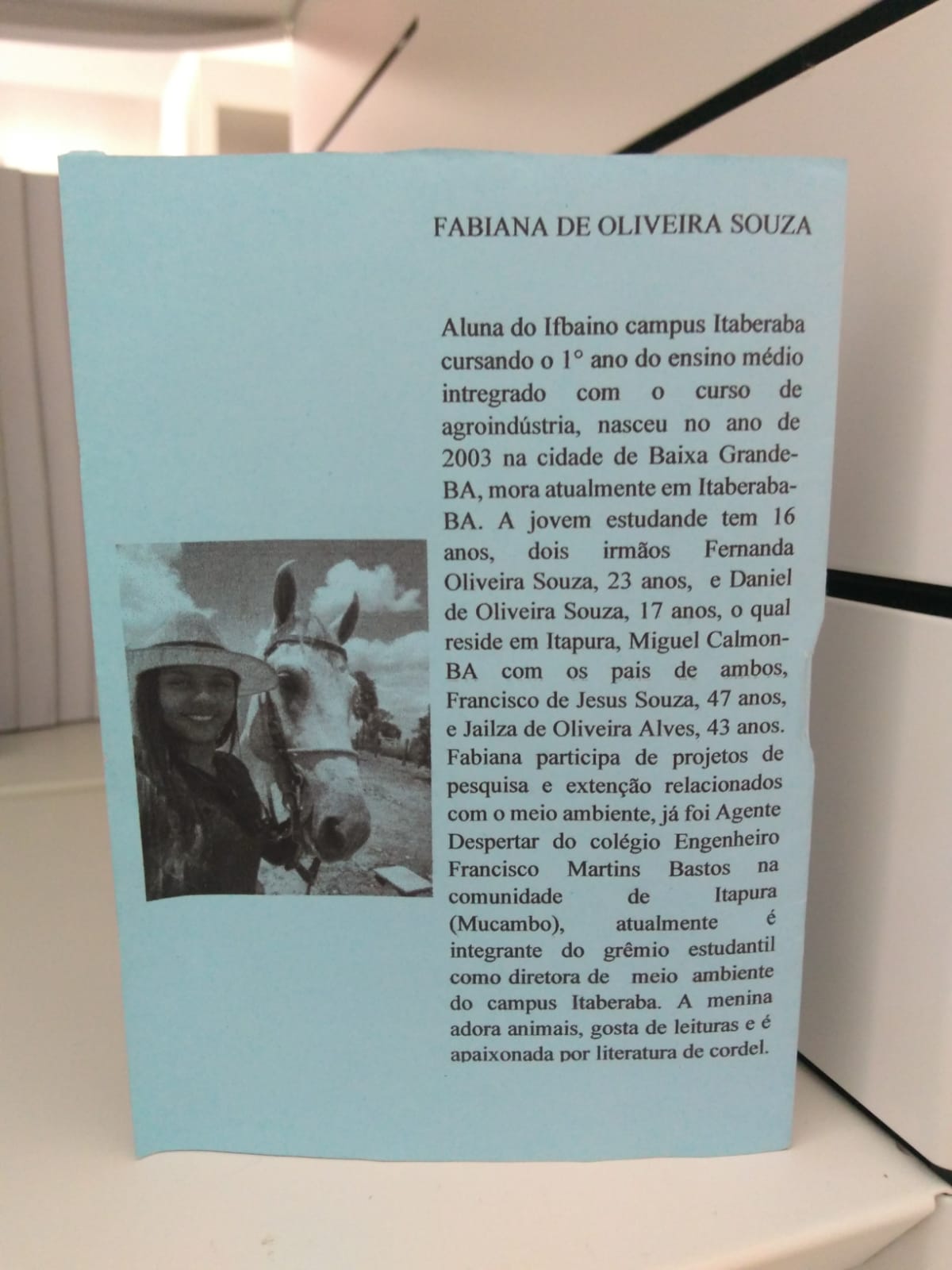 No dia 26 de novembro, na biblioteca do IF Baiano campus Itaberaba, os alunos do 1º ano do Curso Técnico Integrado de Agroindústria recitaram e apresentaram cordéis de autoria própria.