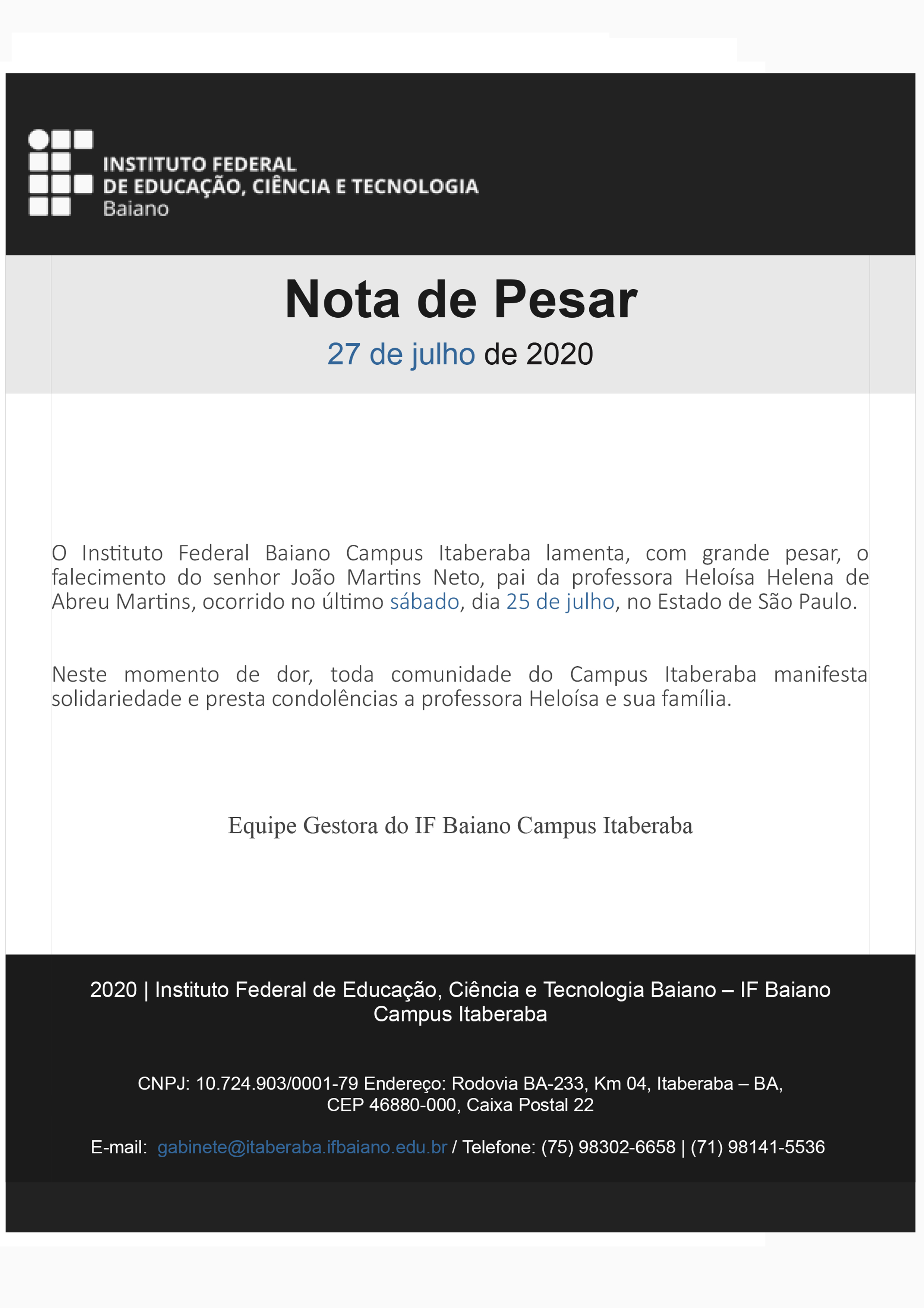 A equipe gestora do Instituto Federal Baiano Campus Itaberaba lamenta, com grande pesar, o falecimento do senhor João Martins Neto, pai da professora Heloísa Helena de Abreu Martins, ocorrido no último sábado, dia 25 de julho, no Estado de São Paulo.