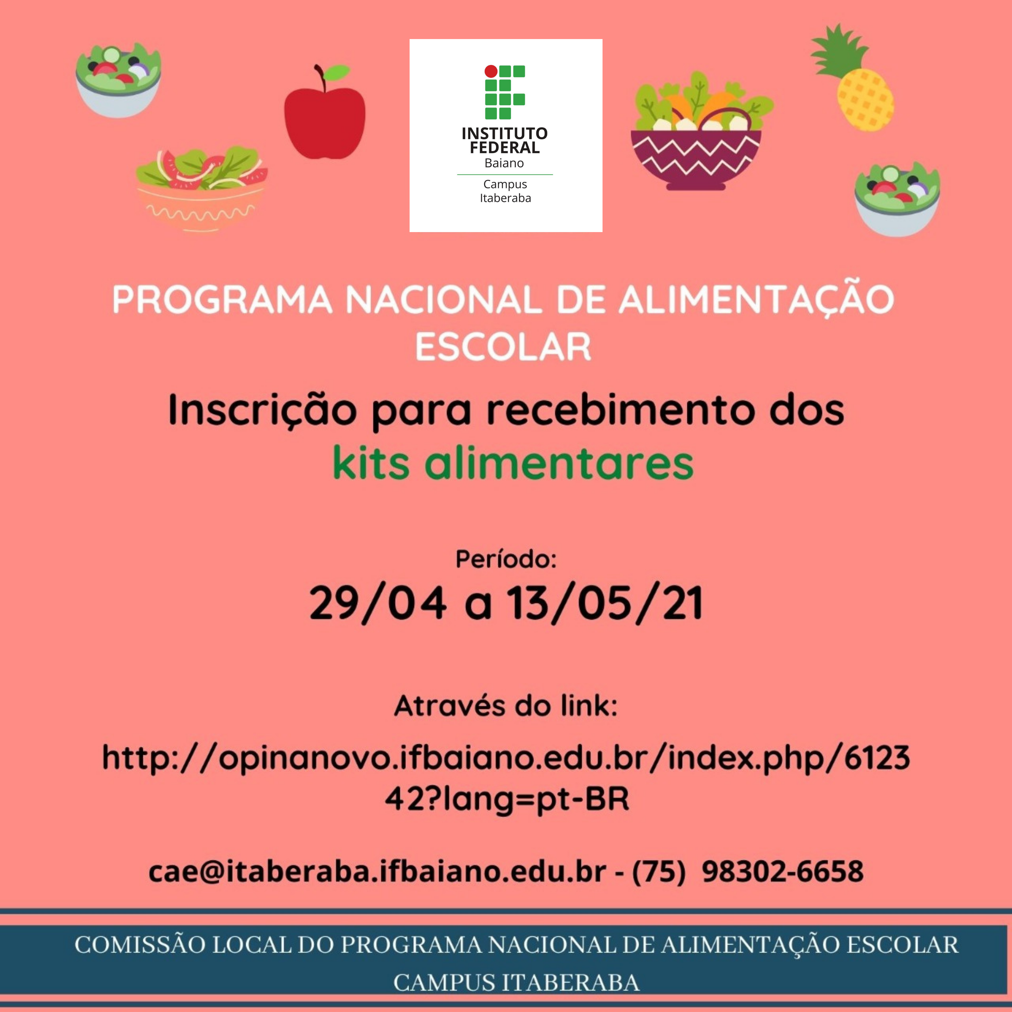 Estão abertas as inscrições para recebimento de kits alimentares adquiridos com recursos do Programa Nacional de Alimentação Escolar – PNAE. Os estudantes interessados devem preencher o formulário do Opina através do link http://opinanovo.ifbaiano.edu.br/index.php/612342?lang=pt-BR, entre os dias 29 de abril a 13 de maio de 2021.