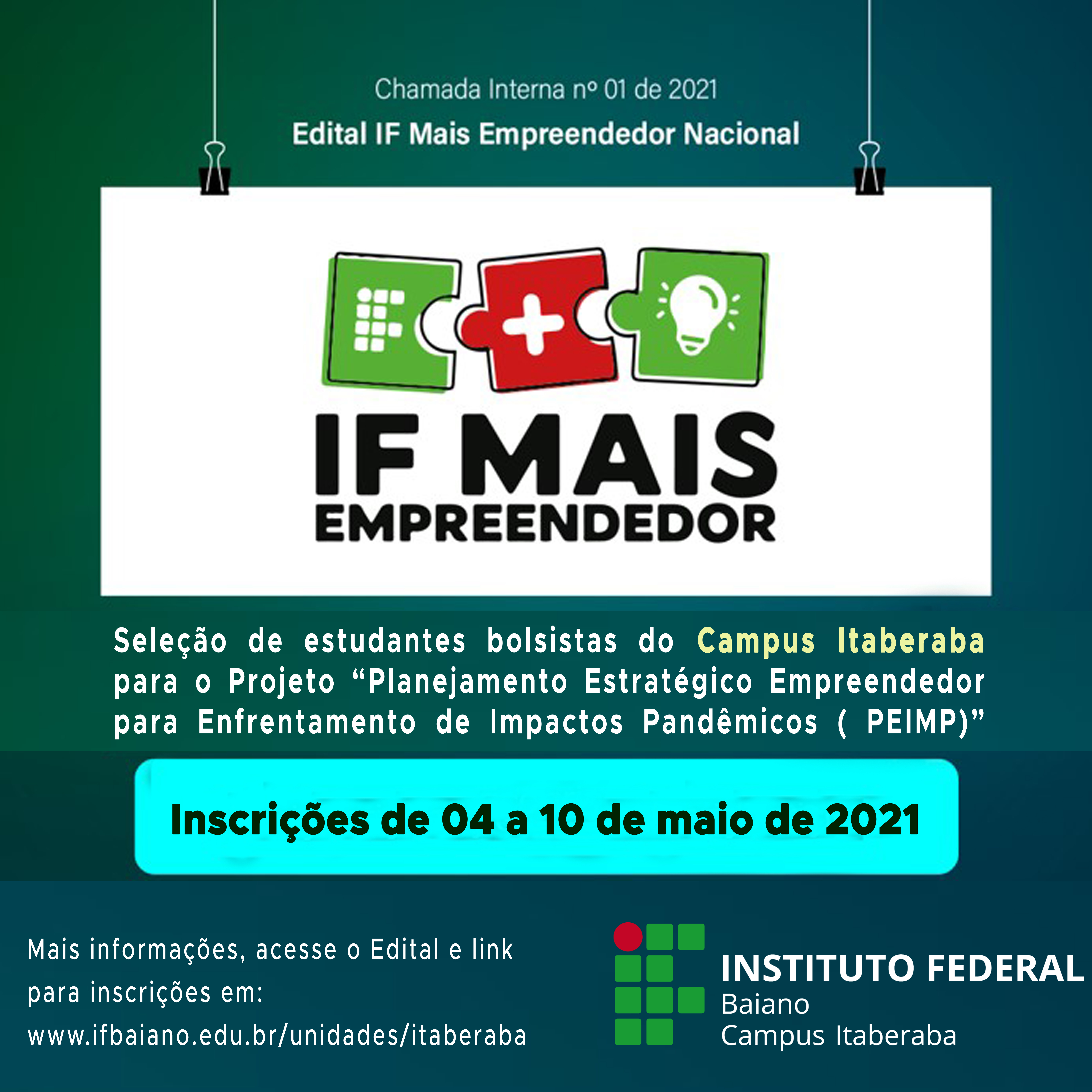 O Edital visa selecionar estudantes dos cursos do Campus Itaberaba, regularmente matriculados, para participação como bolsistas no Edital IF Mais Empreendedor nº 05/2021, sob a coordenação da Profª Drª Aleciane da Silva Moreira Ferreira.