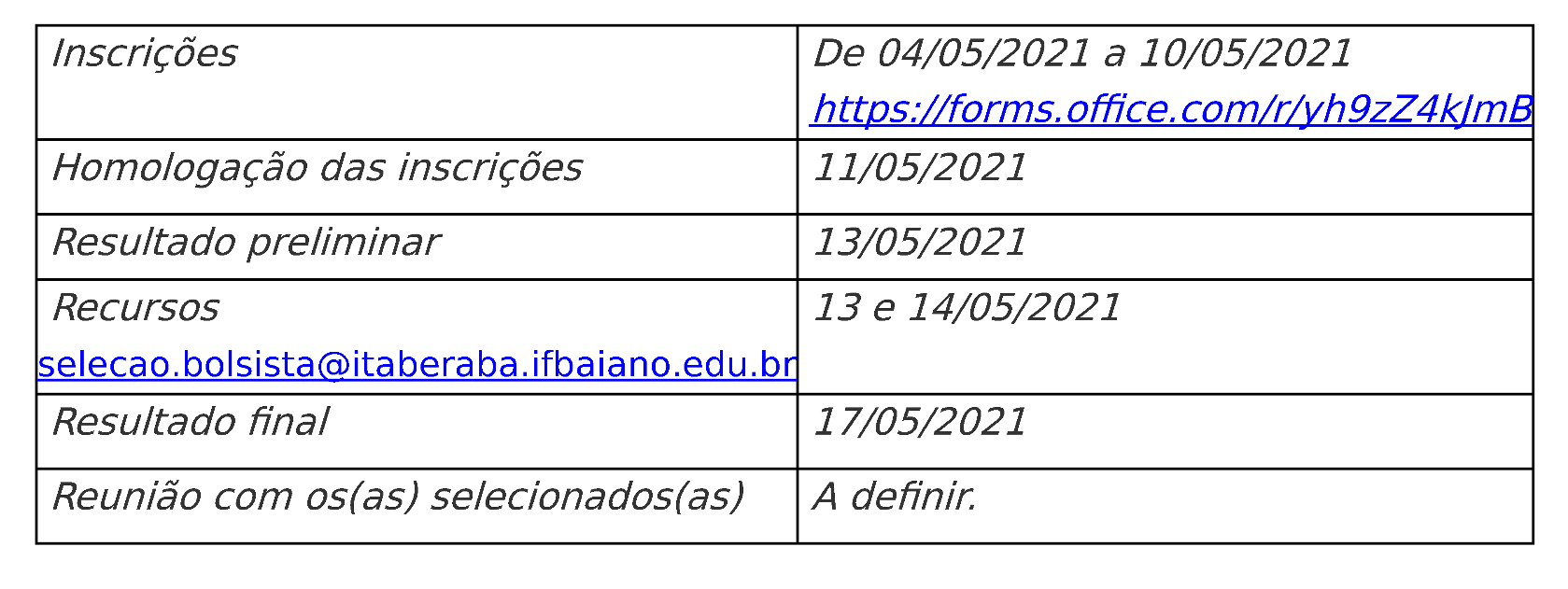 A carta deverá ser redigida pelo candidato, anexada junto ao formulário de inscrição e ter no máximo 1 página. Os estudantes poderão ser contactados para entrevista via Webconferência, caso necessário, as etapas deste processo seletivo devem obedecer o edital e o cronograma abaixos: