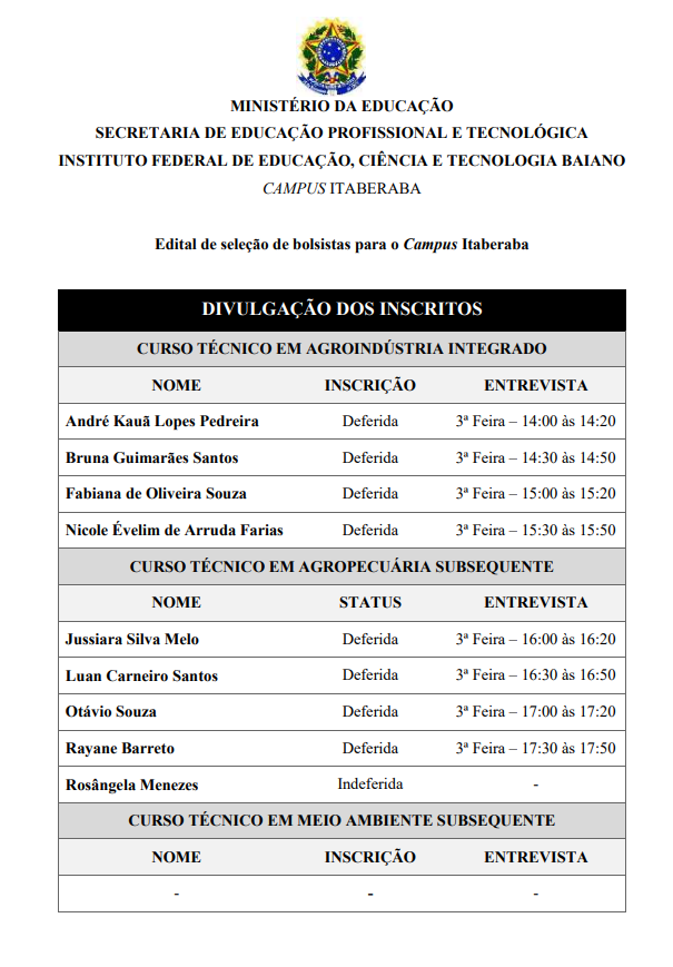 O Instituto Federal de Educação, Ciência e Tecnologia Baiano – Campus Itaberaba torna pública a divulgação dos inscritos e convocação para entrevista do processo de seleção de bolsistas para o projeto intitulado “Avicultura caipira como alternativa dos micro e pequenos empreendedores rurais à crise econômica, sanitária e social decorrente da pandemia de COVID-19”, através do PROGRAMA IF MAIS EMPREENDEDOR NACIONAL – EDITAL Nº 05/2021. Conforme quadro abaixo:
