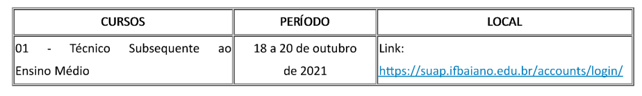 O IF Baiano – Campus Itaberaba, torna público o edital nº 18, de 15 de outubro de 2021 de renovação de matrícula dos estudantes dos Cursos Técnicos Subsequentes para o período letivo de 2021.1, seguindo cronograma indicado abaixo e em consonância com o que rege a Organização Didática dos Cursos da Educação Profissional Técnica de Nível Médio do Instituto Federal de Educação, Ciência e Tecnologia Baiano.