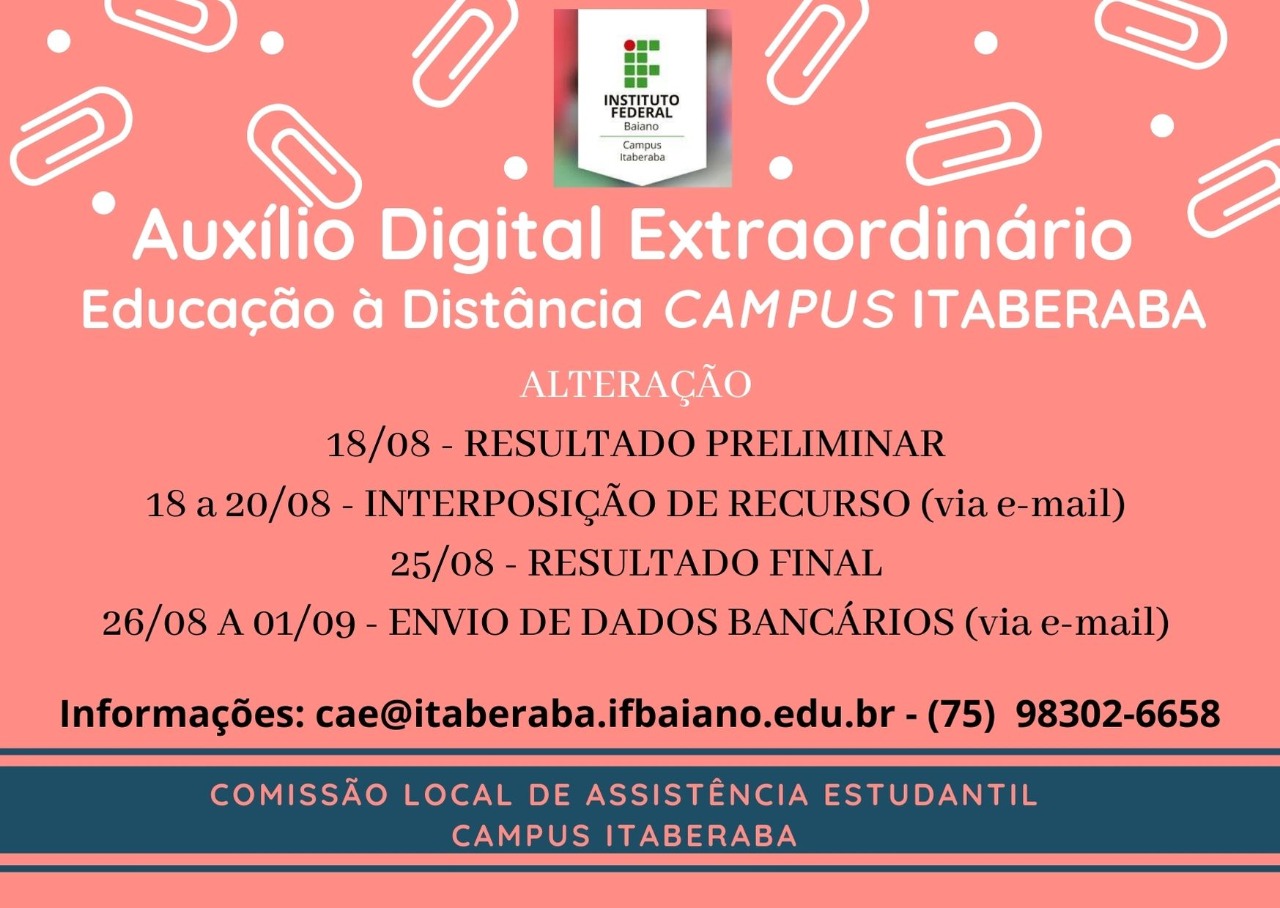 Auxílio concedido aos alunos dos cursos de Educação à Distância do IF Baiano, em situação de maior vulnerabilidade socioeconômica, enquanto perdurar o período de situação de emergência em vigor. No IF Baiano Campus Itaberaba, 55 alunos foram selecionados para receber o Auxílio, conforme os critérios da Resolução 71/2020 de 23 de junho de 2020.