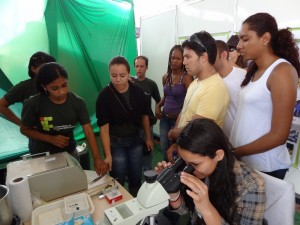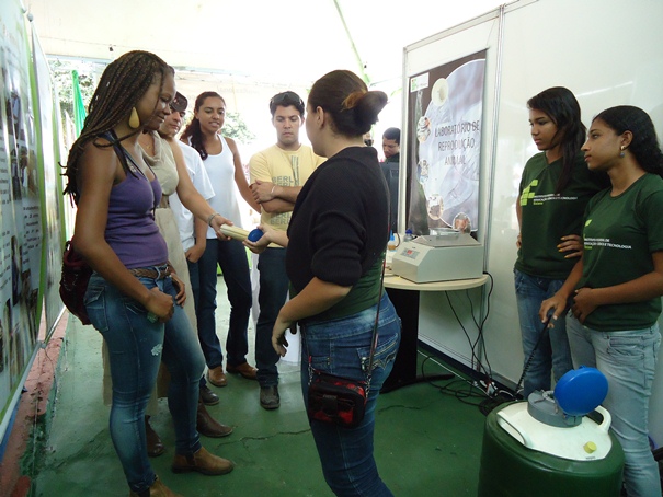 A grande inovação do IF Baiano foi a demonstração de um dos procedimentos de reprodução bovina que será realizado, rotineiramente, no Lara – Laboratório de Reprodução Artificial do campus. A técnica orientada pela médica veterinária e professora, Morgana Cardoso Brasileiro Borges, foi executada pelos alunos do 3° ano do curso Técnico em Agropecuária. Consistiu em uma aula prática sobre equipamentos, manuseio de sêmen bovino congelado, acondicionamento, preparação e análise, com auxílio de microscópio. Os visitantes puderam acompanhar em tempo real, através de TV, o comportamento dos espermatozoides. Por solicitação de uma empresa do ramo de bovinocultura, os discentes realizaram, in loco, a observação de material genético congelado de seu rebanho. As alunas Aline Moura Queiroz e Cristiane dos Santos Sousa, do 3º ano do curso Técnico em Agropecuária, explicam que apesar do nervosismo, foi enriquecedor repassar para o público o conhecimento adquirido no treinamento com a professora Morgana.