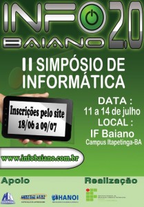 Entre os dias 11 e 14 de julho, alunos dos cursos Técnicos em Informática dos Campi Itapetinga e Bom Jesus da Lapa participaram do Info-Baiano 2.0 – II Simpósio de Informática, promovido pelo IF Baiano – Campus Itapetinga.