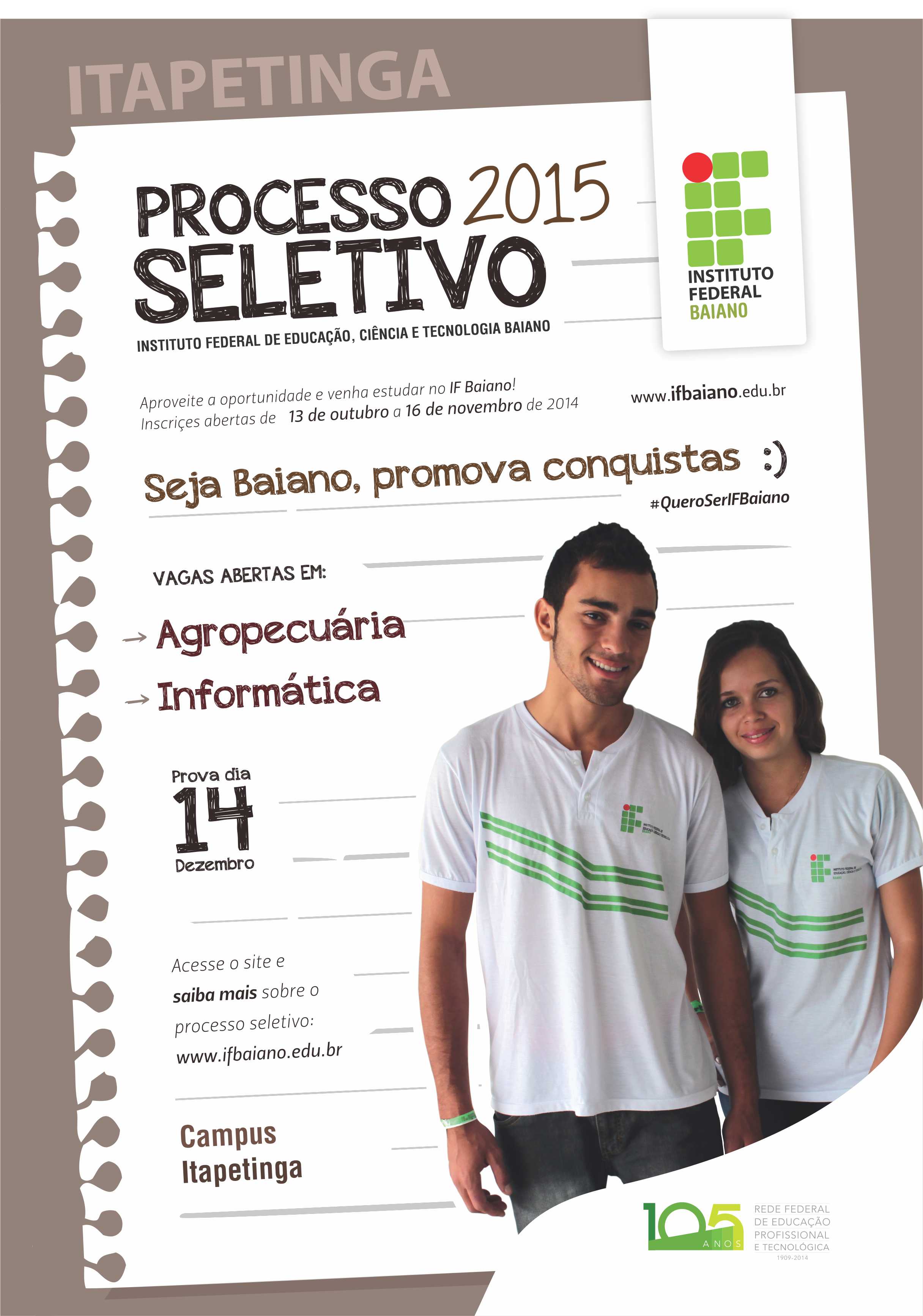Começou nesta segunda, 13 de outubro e seguem até 16 de novembro, as inscrições para o Processo Seletivo 2015 para ingresso de novos estudantes do Instituto Federal Baiano (IF Baiano). As provas serão aplicadas no dia 14 de dezembro, das 9h às 13 h, pelo horário da Bahia.