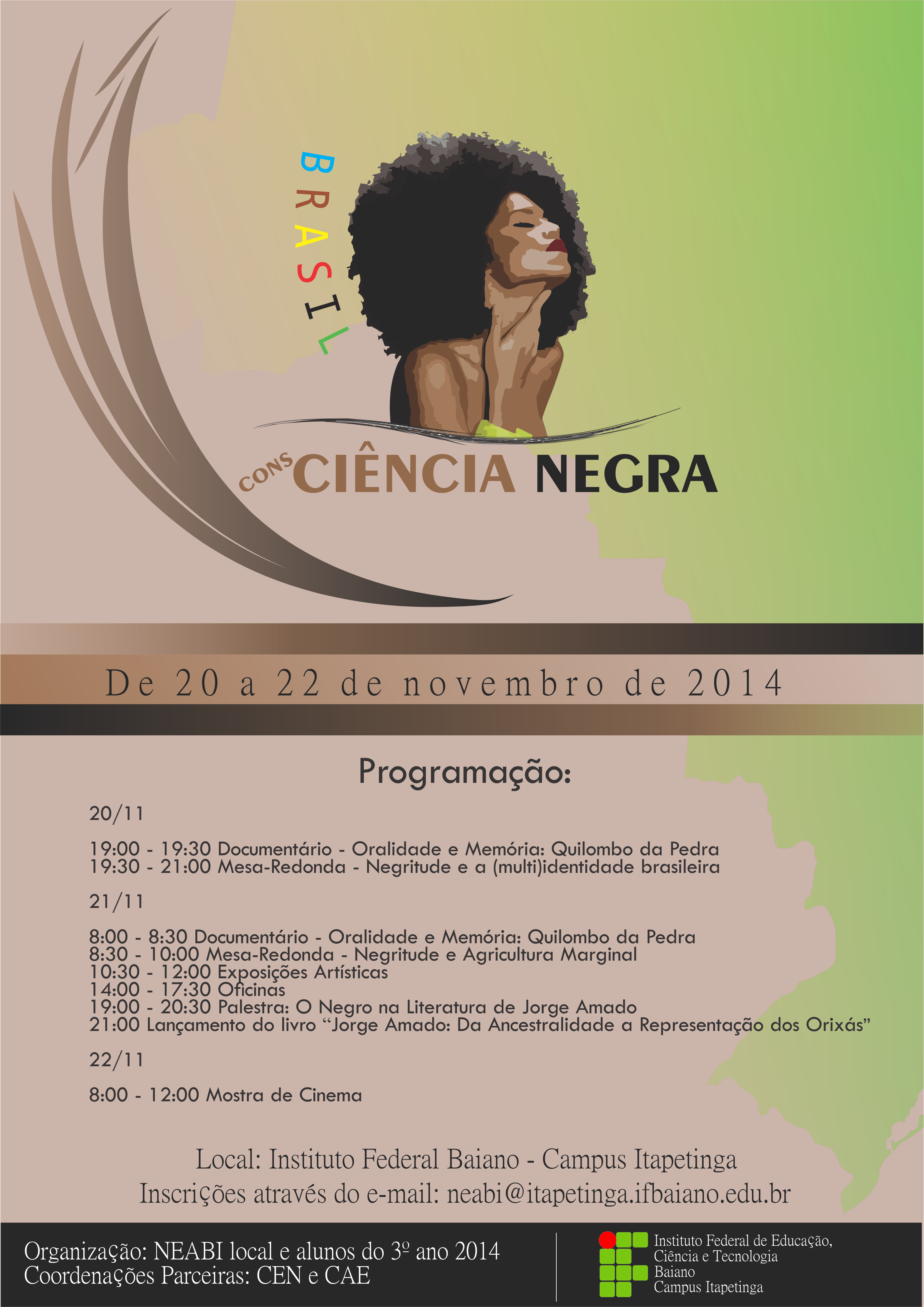 Entre os dias 20 e 22 de novembro, acontece no IF Baiano – Campus Itapetinga o Seminário “Brasil: (Cons) Ciência Negra”. A organização é do Núcleo de Estudos Afro-Brasileiro e Indígena e faz parte da comemoração do Dia da Consciência Negra.