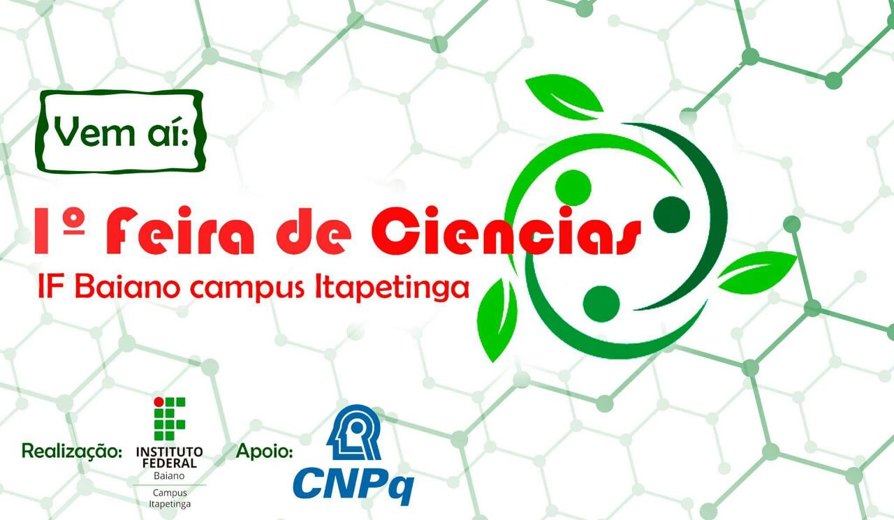 “Ciência e Sustentabilidade no Médio Sudoeste Baiano” é tema da I Feira de Ciências, que acontece nos dias 1 e 2 de dezembro de 2017, no IF Baiano – Campus Itapetinga. Estudantes, professores, servidores, especialistas e a comunidade externa vão participar do evento que é apoiado pelo Edital CNPq/MCTIC/SECIS Nº 24/2016 – Feiras de Ciências e Mostras Científicas.