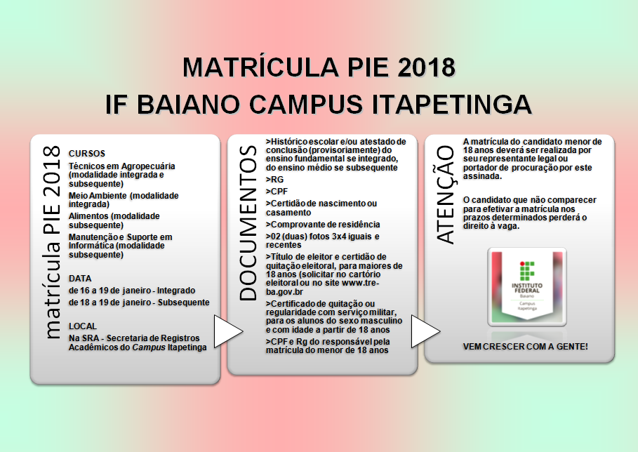 O Instituto Federal Baiano Campus Itapetinga torna público a edital de matrículas para os cursos Técnicos de Agropecuária (modalidade integrada e subsequente), Meio Ambiente (modalidade integrada), Alimentos (modalidade subsequente) e Manutenção e Suporte de Informática (modalidade subsequente) dos candidatos selecionados no Processo de Ingresso de Estudantes – PIE – 2018.