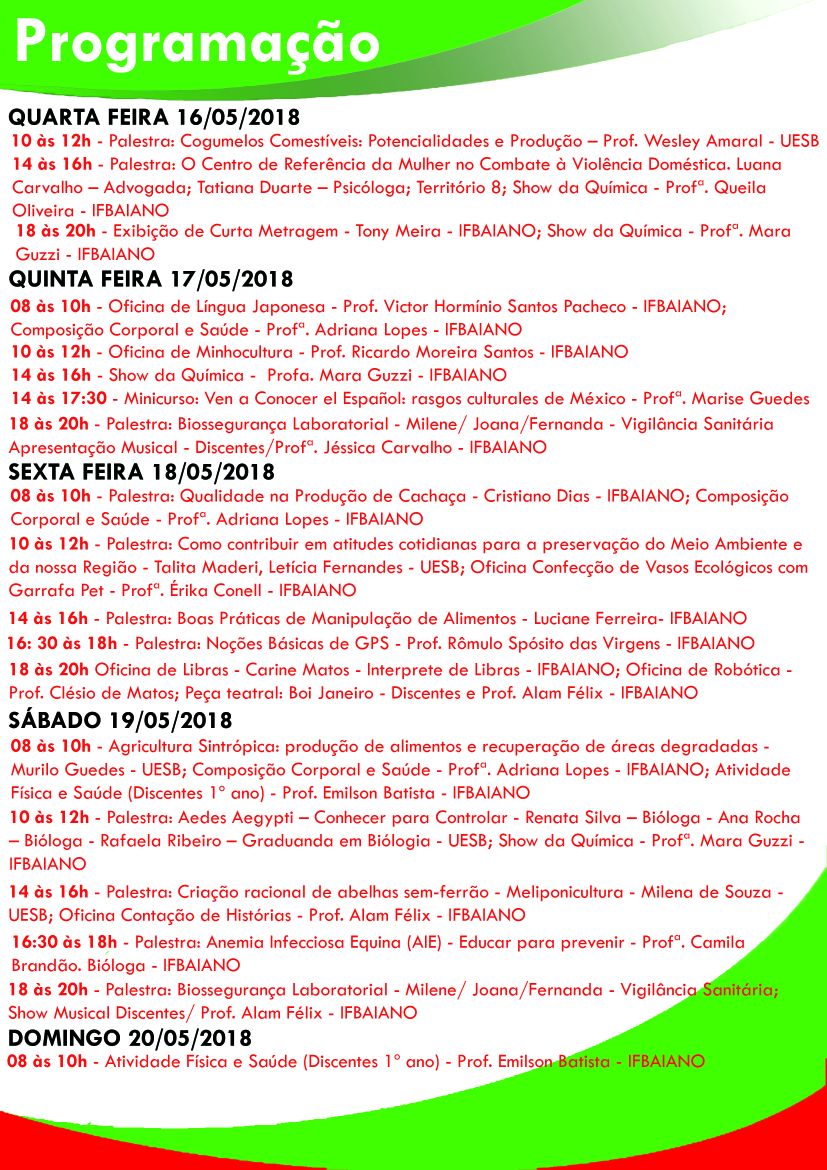 Para o Instituto Federal de Educação, Ciências e Tecnologia Baiano, a interface entre o Ensino, a Pesquisa e a Extensão é um dos nossos fundamentos legais e para participar do evento apresentamos área de convivência, área de exposições, oficinas, palestras, eventos culturais, biblioteca e muito mais em um espaço a cada ano melhor.
