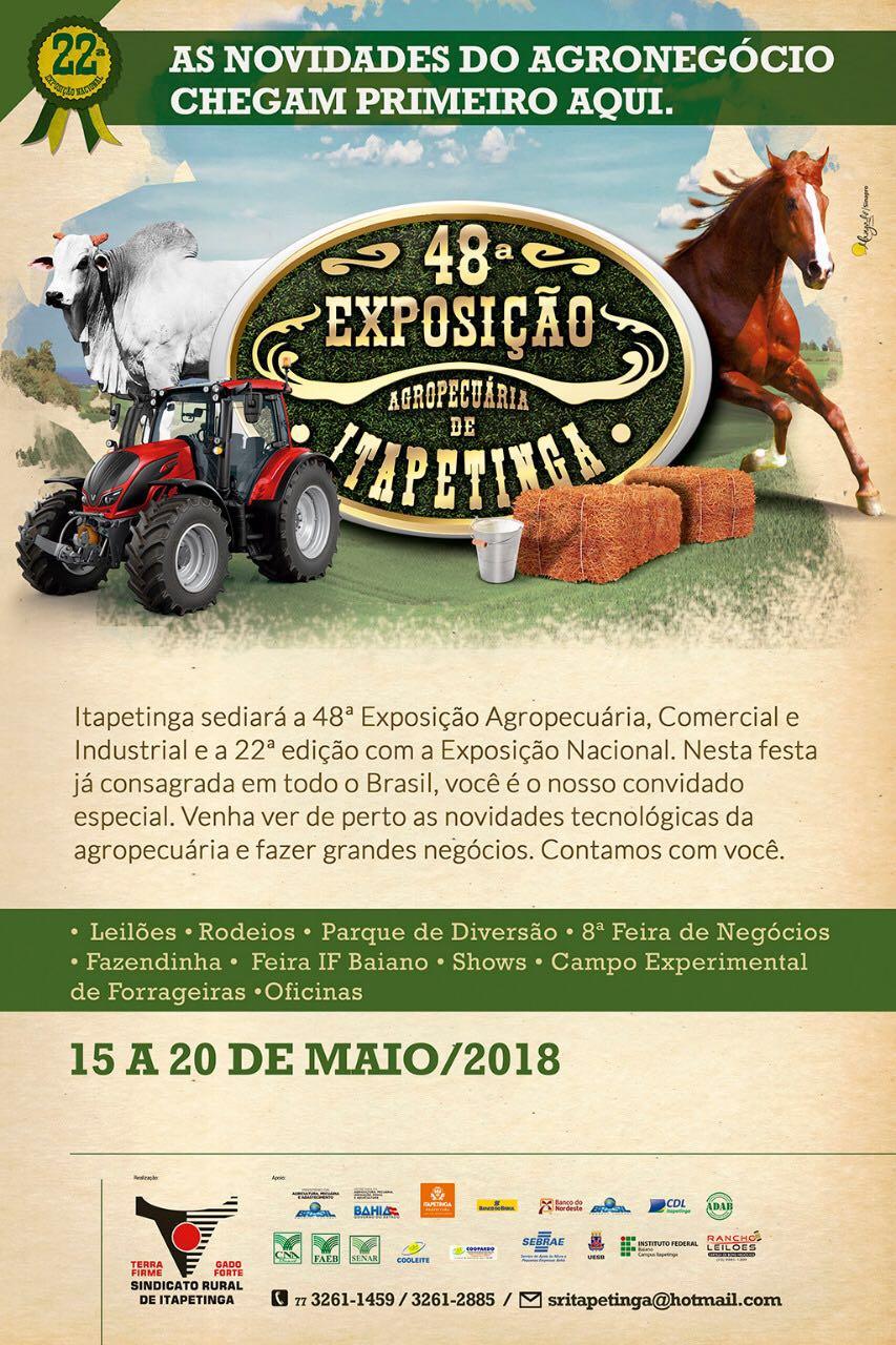 Entre os dias 15 a 20 de maio de 2018, no Parque de Exposições Juvino Oliveira, acontecerá a 48ª Exposição Agropecuária de Itapetinga, um grandioso e tradicional evento de porte nacional realizado pelo Sindicato Rural de Itapetinga com parcerias, como o IF Baiano.
