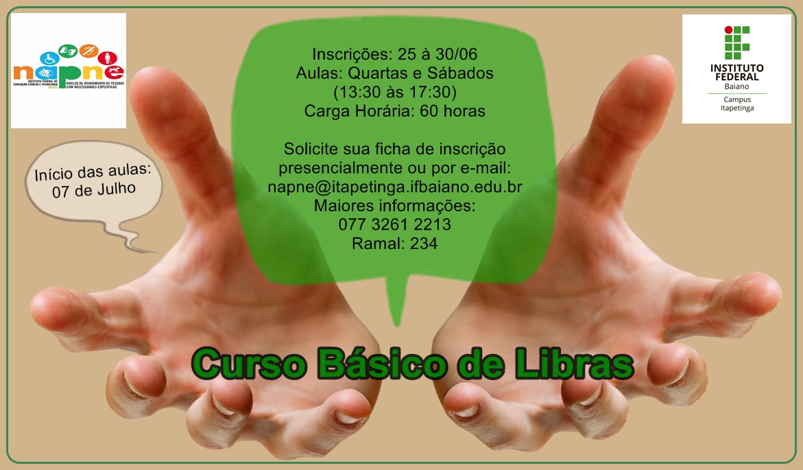 Visando promover a comunicação entre indivíduos surdos e ouvintes, o Instituto Federal Baiano Campus Itapetinga, através do Núcleo de Atendimento às Pessoas com Necessidades Específicas – NAPNE – abre 25 vagas para toda a comunidade (15 vagas para comunidade interna – docentes, discentes, taes e terceirizados – e 10 vagas para comunidade externa) em Curso Básico de Libras.