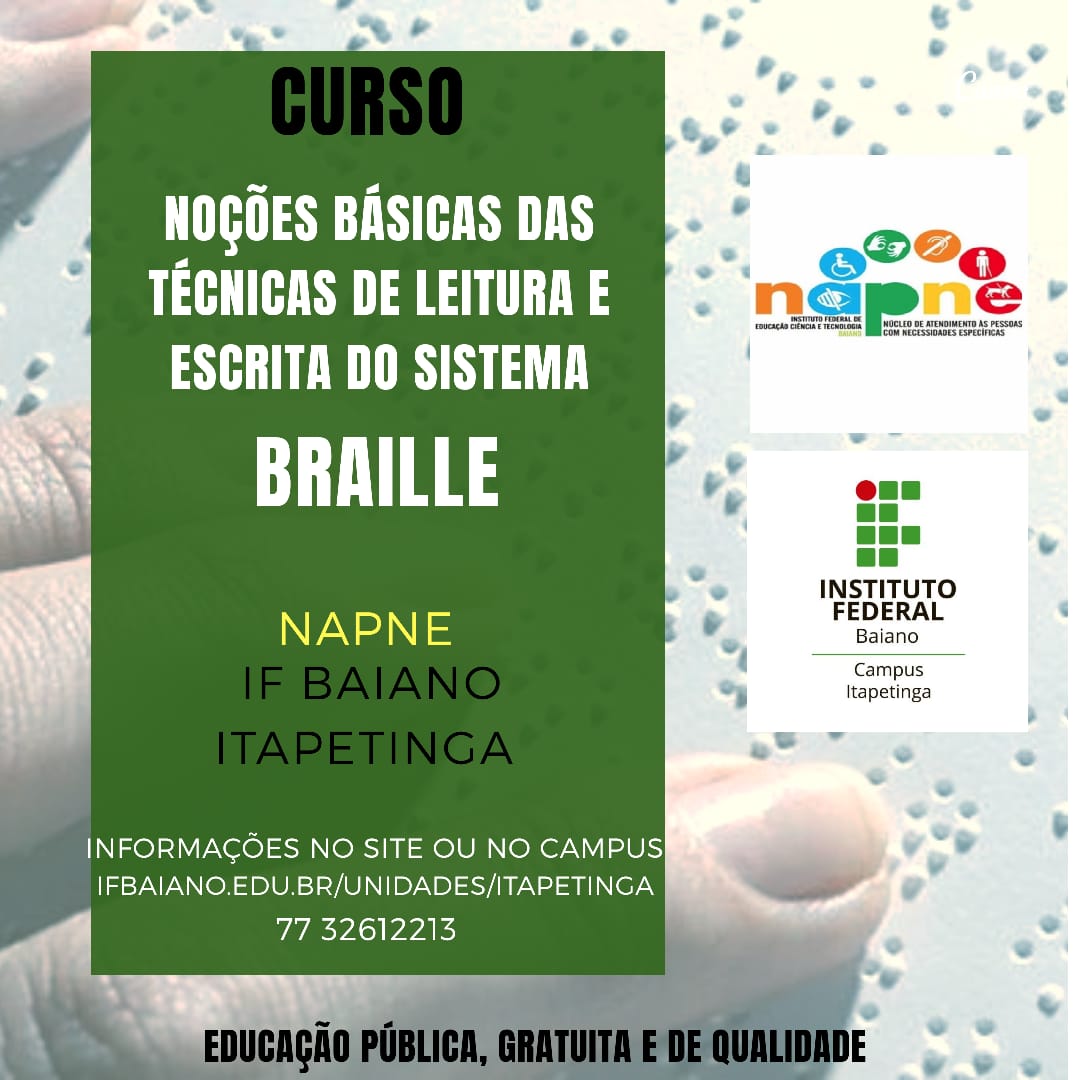 O Instituto Federal de Educação, Ciência e Tecnologia Baiano Campus Itapetinga oferecerá, entre julho e novembro de 2019, o curso Noções Básicas das Técnicas de Leitura e Escrita no Sistema Braille.
