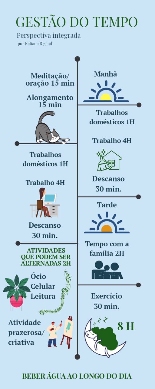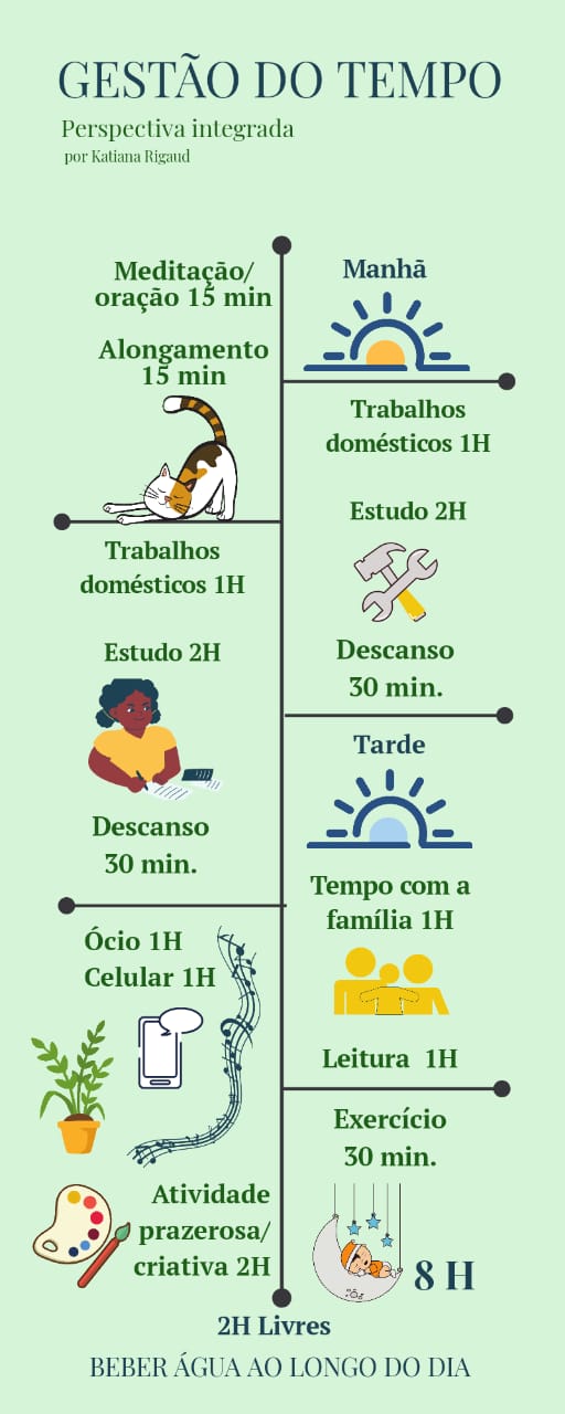 Veja duas simulações de gestão do tempo, uma mais voltada para estudantes e outra para pessoas que estão trabalhando em casa, lembrando que você pode adaptar à sua rotina sem dispensar tempo com bem-estar e saúde: