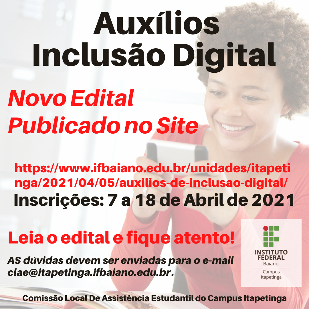 O IF Baiano Campus Itapetinga lança o Edital nº 01/2021 do Programa de Inclusão Digital que estabelece as normas e critérios para seleção de estudantes em vulnerabilidade socioeconômica, de cursos presenciais e a distância, para vagas remanescentes.