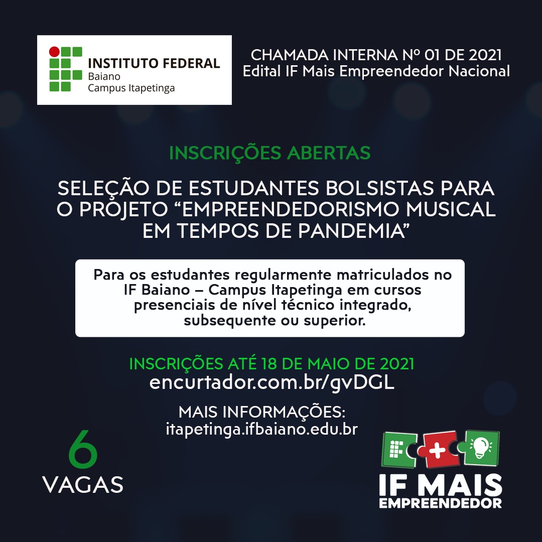 O IF Baiano Itapetinga torna pública a chamada para seleção de bolsistas para o projeto do Campus aprovado na Chamada 01/2021-PROEX, referente ao EDITAL Nº 05/2021 – PROGRAMA IF MAIS EMPREENDEDOR NACIONAL, conforme o edital: