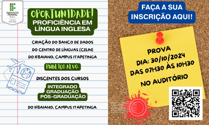 Para dar início ao processo de identificação de alunos proficientes em línguas no campus Itapetinga, serão realizados, no dia 30/10/2024, os testes de proficiência em Língua Inglesa, das 7:30 às 10:30, nas dependências do campus.