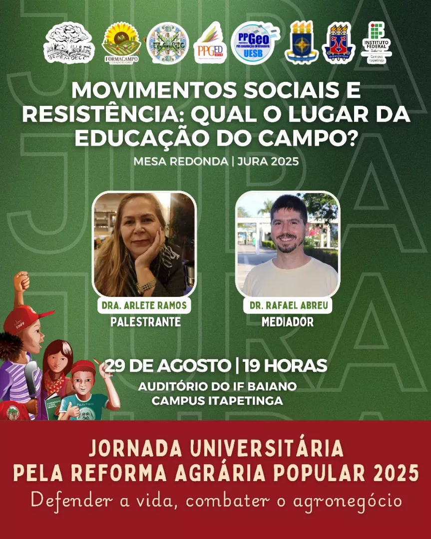 A programação contará com a mesa-redonda “Movimentos sociais e Resistência: qual o lugar da Educação do Campo?”, que tem como objetivo refletir sobre a participação dos movimentos sociais na luta pela igualdade social na Educação do Campo. O debate será conduzido pela professora Dra. Arlete Ramos (UESB), palestrante convidada, e contará com a mediação do professor Dr. Rafael de Abreu (IF Baiano – Campus Itapetinga).