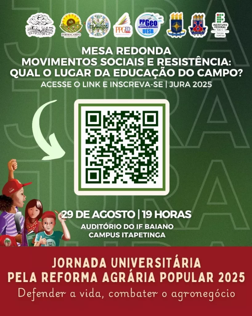 No dia 29 de agosto, o IF Baiano, campus Itapetinga, receberá uma das atividades da X Jornada Universitária pela Reforma Agrária (JURA), promovida pela Universidade Estadual do Sudoeste da Bahia (UESB).