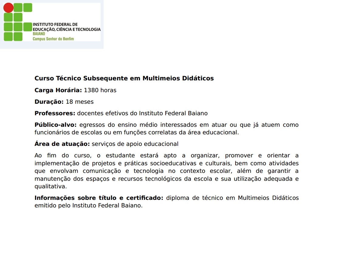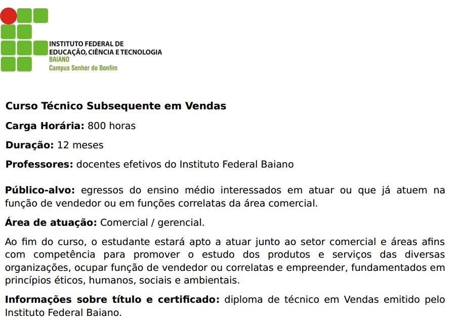 Informações sobre título e certificado: Diploma de técnico em Vendas emitido pelo Instituto Federal Baiano.
