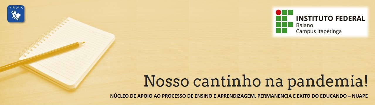 O Núcleo de Apoio ao Processo de Ensino e Aprendizagem, Permanência e Êxito do Educando (NUAPE) é formado por Pedagogos e Técnicos em Assuntos Educacionais do campus Itapetinga. Estamos preparando diversos materiais que serão disponibilizados aqui na área do aluno no site do IF Baiano campus Itapetinga. O espaço foi carinhosamente denominado de “Nosso cantinho … Continue lendo Nosso Cantinho na Pandemia – NUAPE