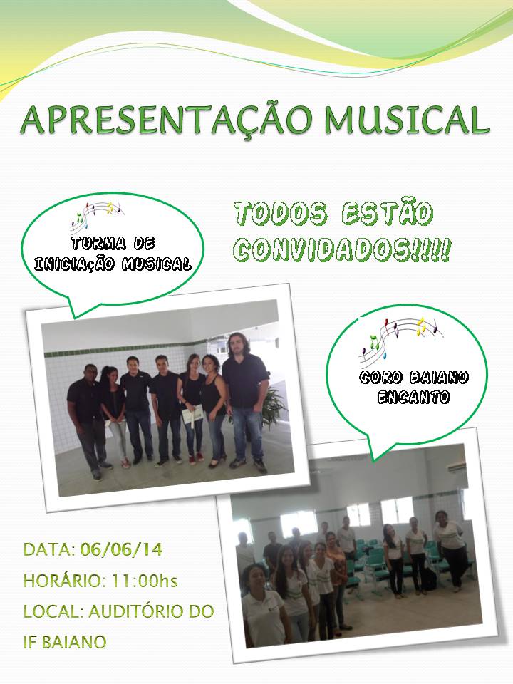 Convidamos toda a comunidade acadêmica do IF Baiano para a apresentação musical que será realizada amanhã (sexta-feira), 06/06/2014, aqui no auditório do campus às 11:00 horas.