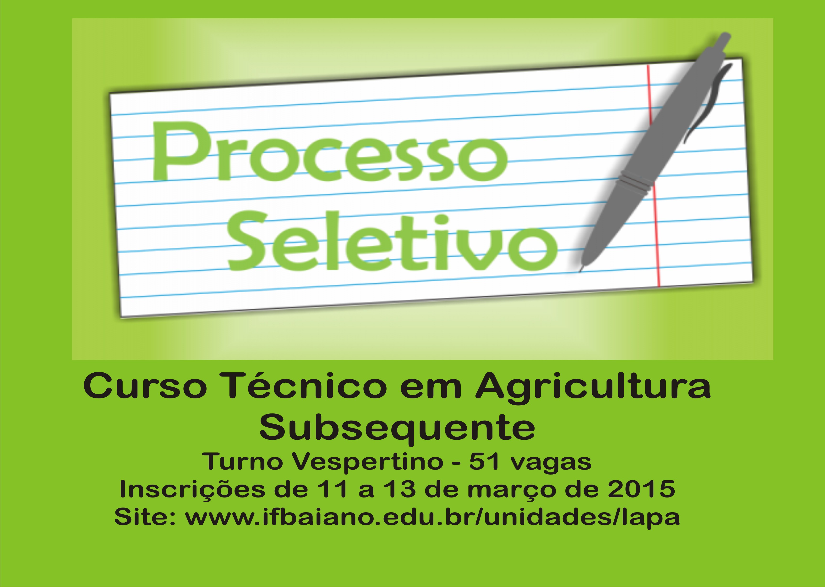 As inscrições estão abertas no período de 11 a 13 de março de 2015, no site: www.ifbaiano.edu.br/unidades/lapa, clicando no link: Processos Seletivos.