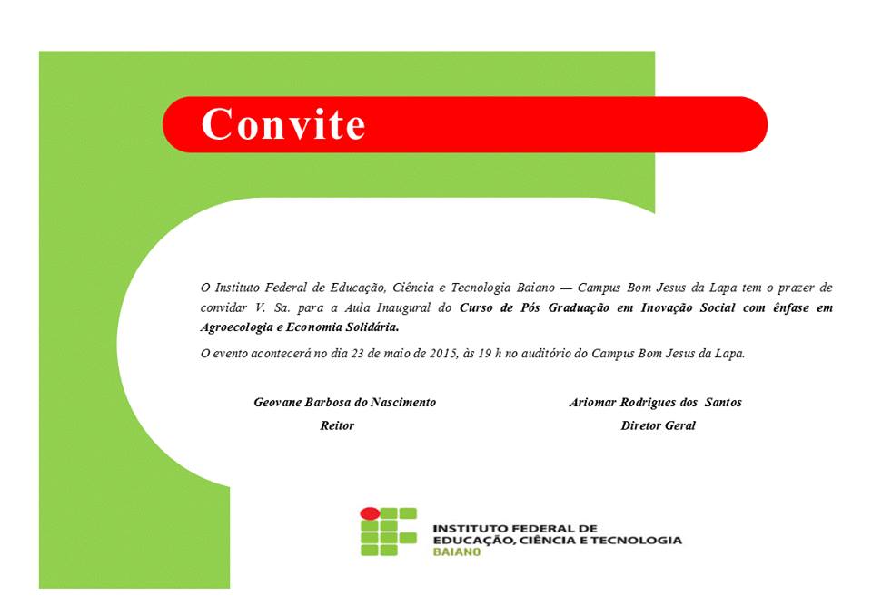 Convite da aula inaugural da Especialização em Inovação Social