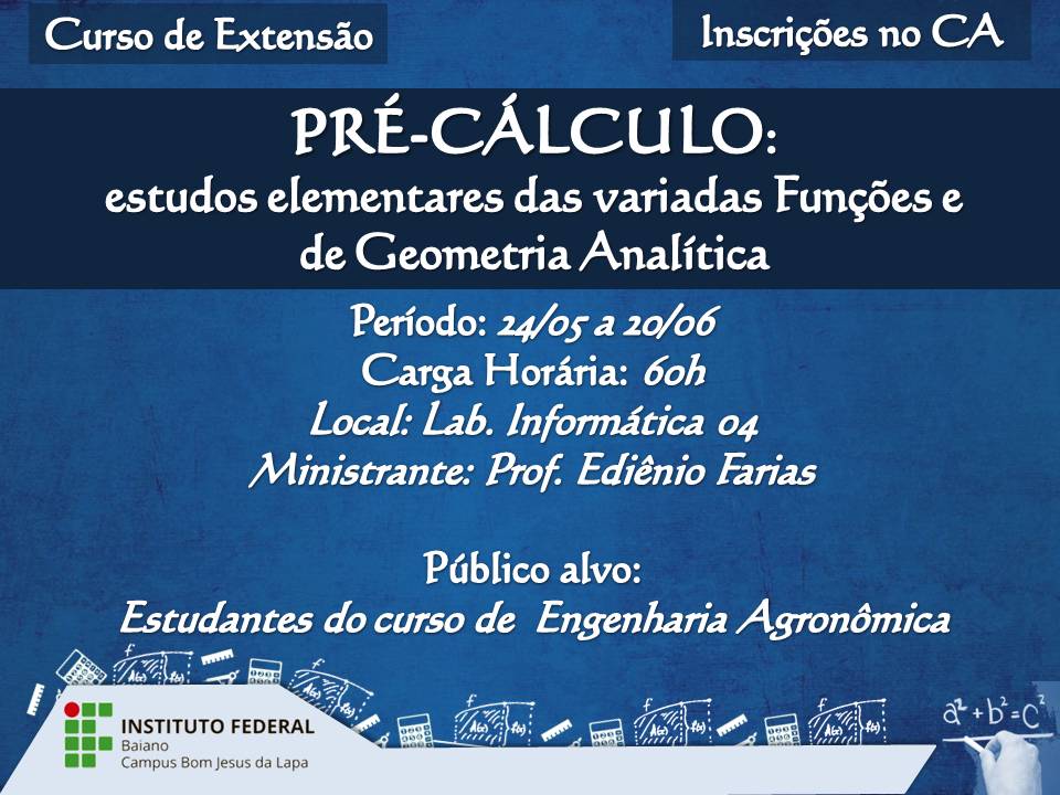 O projeto objetiva a realização de oficinas matemáticas, em ambiente informatizado, com alunos da graduação de Engenharia Agronômica, do IF Baiano/Campus Bom Jesus da Lapa. Espera-se que os alunos, no decorrer das aulas, aprendam os conceitos e significados em relação às variadas Funções e à Geometria Analítica, adquirindo autonomia para resolver situações-problema ligados à Matemática e Agronomia. Ao final, busca-se uma aprendizagem satisfatória por partes alunos, deixando-os mais estimulados para a aplicação dos cálculos algébricos na área da engenharia, principalmente pelo uso dos softwares GrafEq e Winplot.