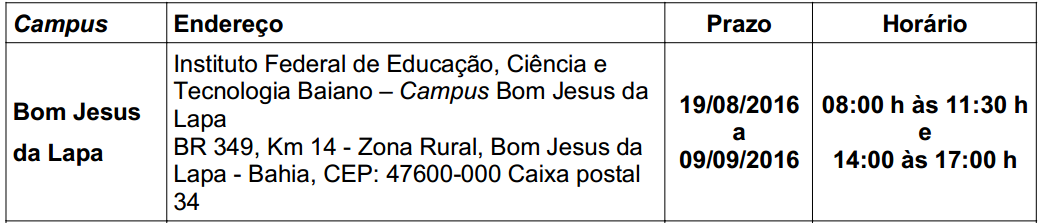 A documentação solicitada deverá ser entregue diretamente no Campus para qual fez a opção do curso, no endereço, prazo e horário, conforme tabela abaixo: