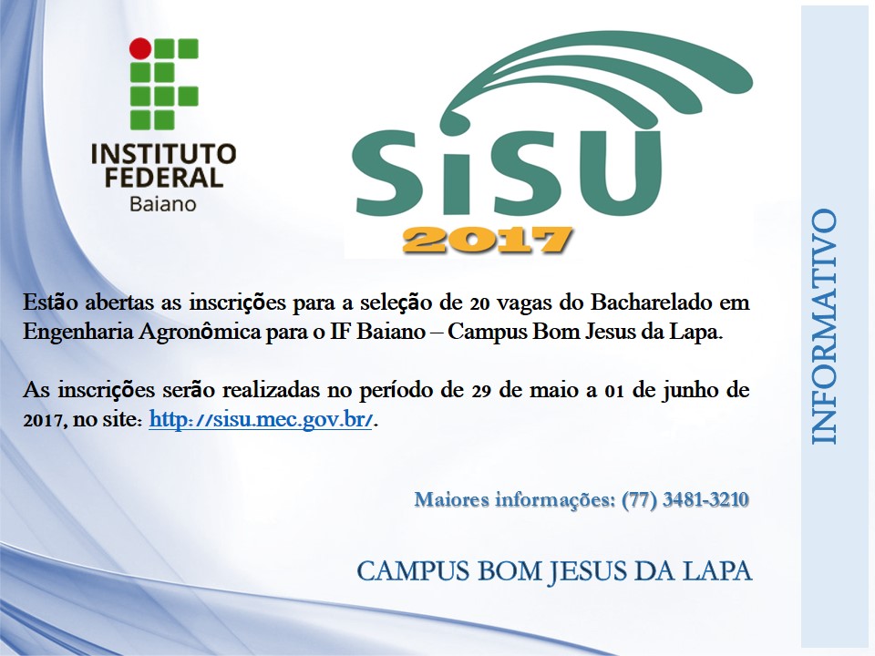 Nessa etapa, o IF Baiano está ofertando 140 vagas para os campi Campus Santa Inês, nos cursos de Biologia (40), Geografia (40) e Zootecnia (40), e para o Campus Bom Jesus da Lapa, no curso de Engenharia Agronômica (20).
