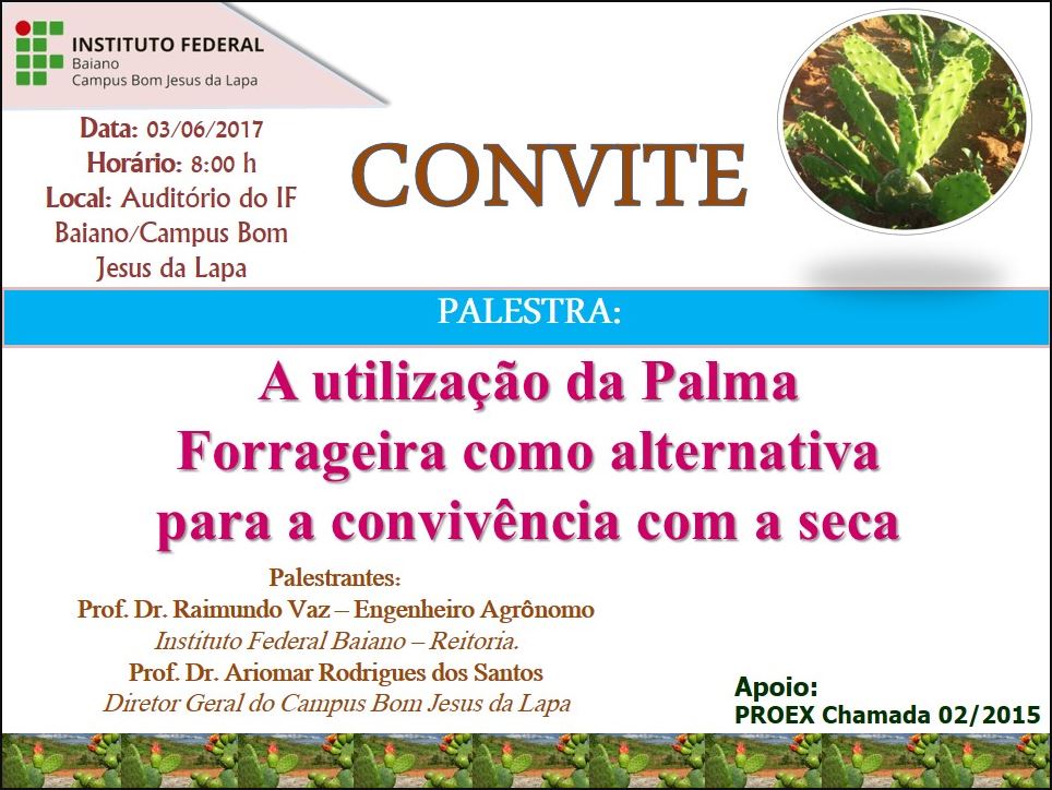 O Campus Bom Jesus da Lapa realizará, no próximo dia 03 de junho de 2017, às 08:00h, no auditório, a Palestra ” Utilização da Palma Forrageira como alternativa para a convivência com a seca”. A atividade integra as ações de um projeto de extensão de mesmo nome, vinculado à Chamada PROEX 02/2015, sob a coordenação do Professor Ariomar Rodrigues dos Santos.