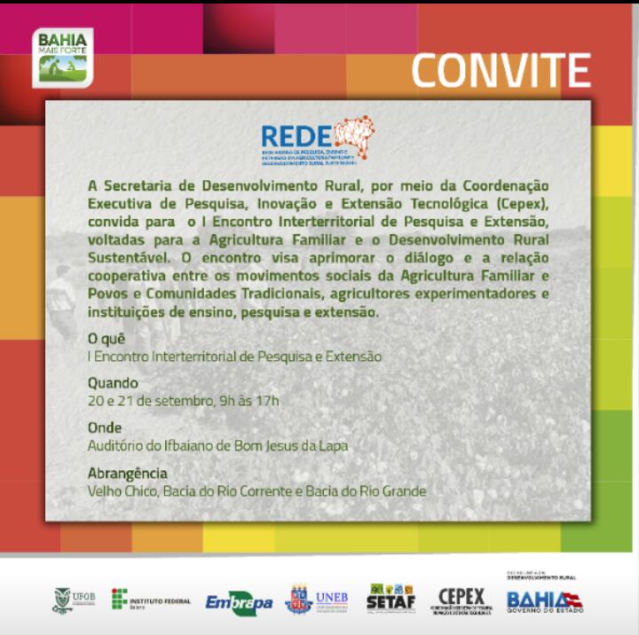 IF Baiano Campus Bom Jesus da Lapa realiza I Encontro Interterritorial de Pesquisa e Extensão, voltadas para a Agricultura Familiar e o Desenvolvimento Rural Sustentável, que acontecerá nos dias 20 e 21 de setembro, das 9h às 17h. Local: Auditório do IF Baiano – Campus Bom Jesus da Lapa.