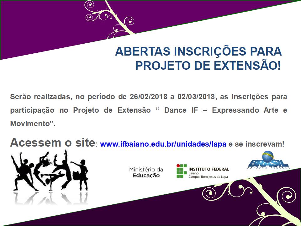 Estão abertas as inscrições para o Projeto de Extensão “IF DANCE – Expressando Arte e Movimento”. As inscrições vão até o dia 02/03 e serão feitas pelo link: https://goo.gl/NFgi35