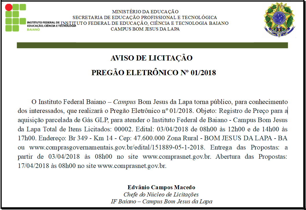 Aviso de Licitação – Pregão Eletrônico nº 01/2018