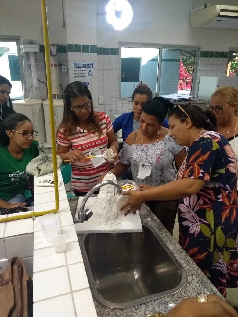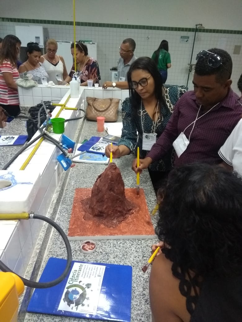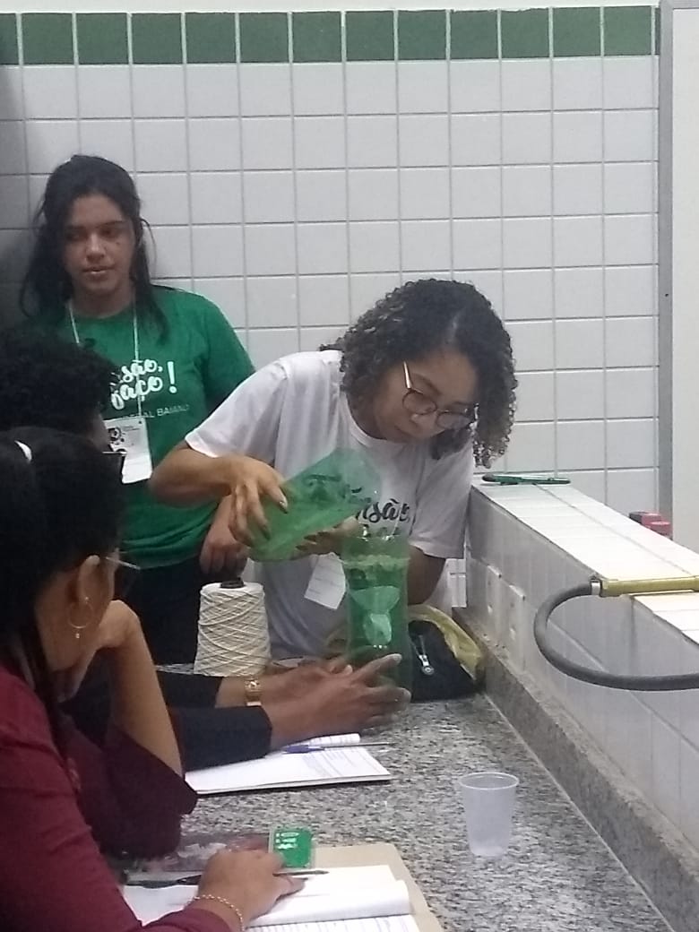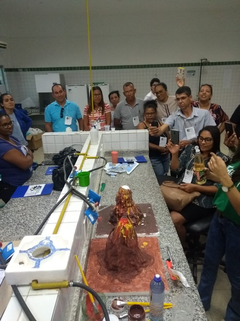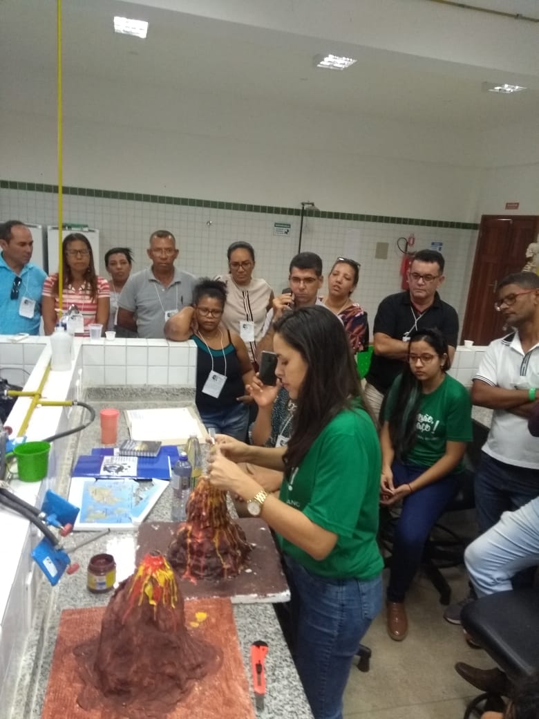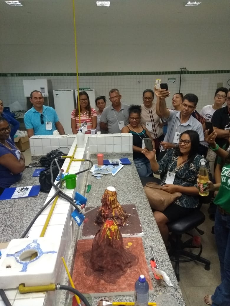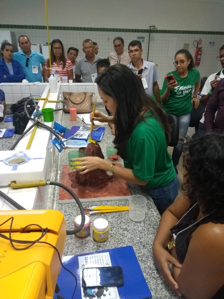 O IF Baiano campus Bom Jesus da Lapa recebeu, no último dia 24 de julho, 28 professores do município de Serra do Ramalho para a primeira oficina do projeto de extensão Ciência Itinerante: uma experiência de formação continuada com professores de ciências naturais do município de Serra do Ramalho – Bahia. O encontro ocorreu durante todo o dia e contou com três momentos de formação nos quais os participantes desenvolveram atividades práticas voltadas ao ensino de ciências para estudantes do ensino fundamental, séries finais. Pela manhã, a professora Francine Katariny abordou o tema poluição da água e produziu com os participantes um modelo de estação de tratamento de água. Em seguida, a professora Juliana Carvalhais trabalhou a temática “lixo: um problema sócio-ambiental”, discutindo a produção de lixo nos espaços escolares e possíveis soluções para a redução, reaproveitamento e condução adequada dos resíduos sólidos para reciclagem. À tarde, a professora Maria Aparecida fez duas oficinas sobre “Dinâmica da Terra”. Em uma delas, os professores produziram um modelo de placas tectônicas e na outra um vulcão. Ao final do dia, os participantes compartilharam suas impressões sobre os trabalhos desenvolvidos e expectativas para a próxima formação que já foi agendada para o dia 28 de agosto.