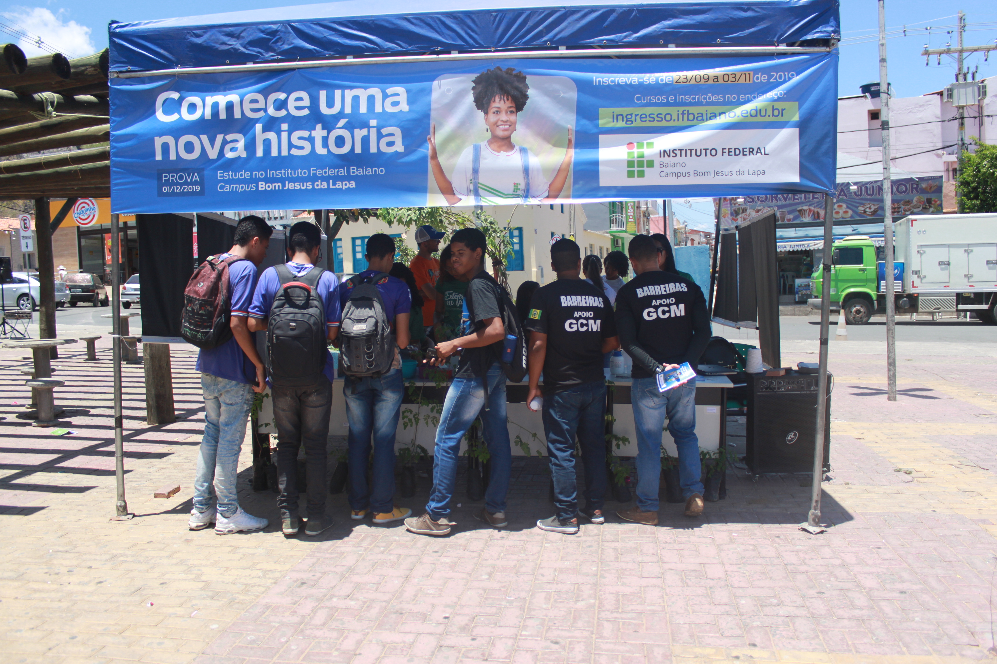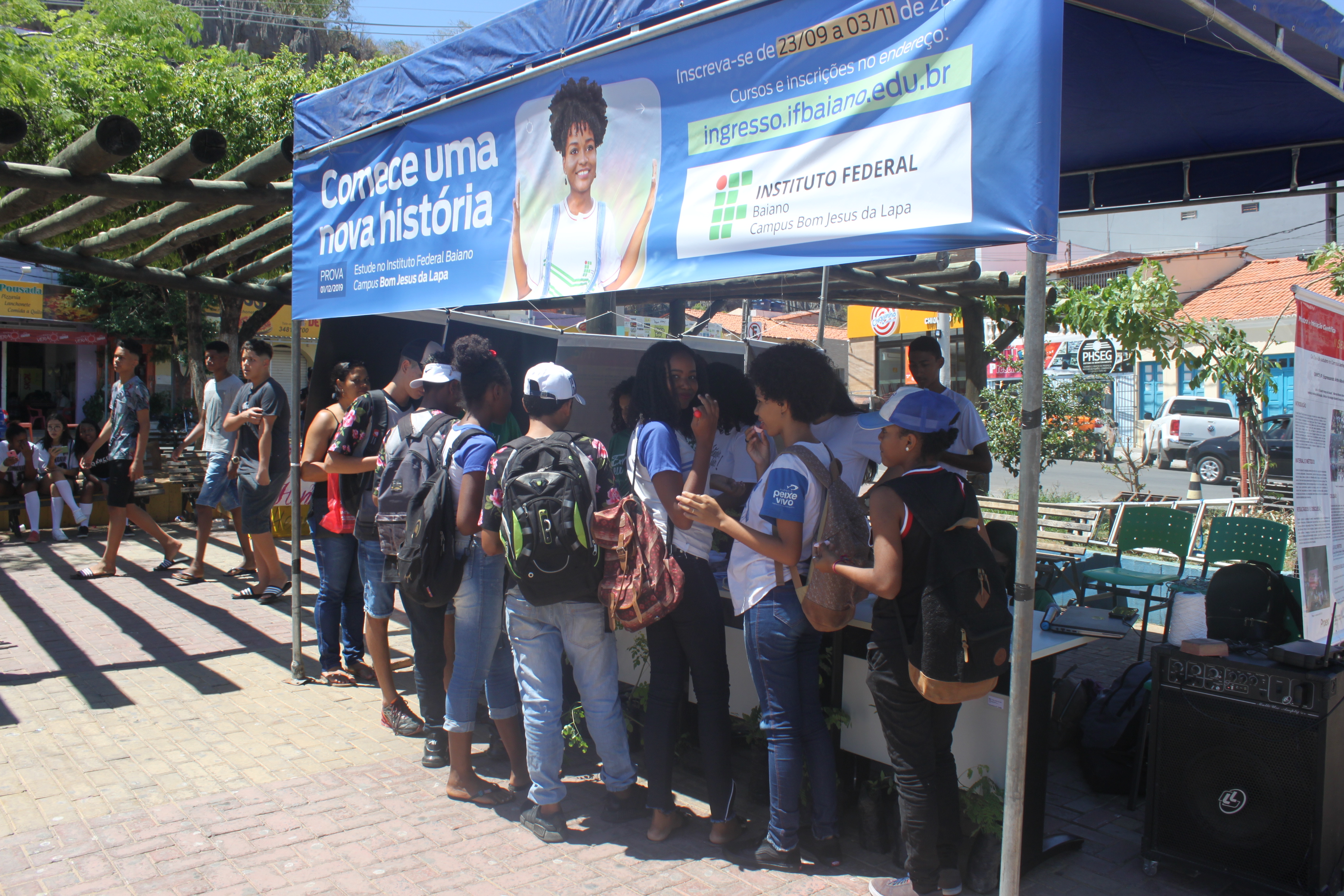 A comissão local do processo seletivo realizou, no dia 18 de outubro de 2019, um momento de integração entre IF Baiano e Comunidade Externa. O evento intitulado “IF na Praça” teve como objetivo dar visibilidade às ações de ensino, pesquisa e extensão desenvolvidas no Campus e fortalecer o diálogo junto à comunidade de Bom Jesus da Lapa. O stand contou com exposição de trabalhos, experimentos na área de química e degustação de comidas produzidas por estudantes da agroecologia. Na oportunidade houve divulgação e esclarecimentos de dúvidas sobre o Processo de Ingresso de Estudantes 2020. Durante a manhã foram realizadas apresentações do grupo “Dance IF” e do grupo de Taekowndo, ambos integram os projetos de extensão do Campus Bom Jesus da Lapa. A ação possibilitou uma aproximação com a população de Bom Jesus da Lapa e fortalecimento da identidade institucional no Território Velho Chico.