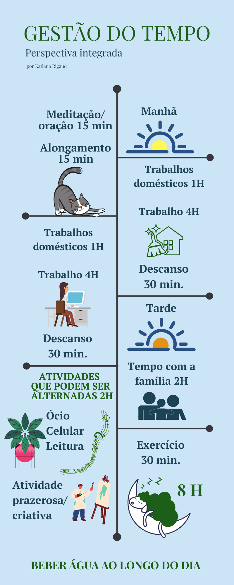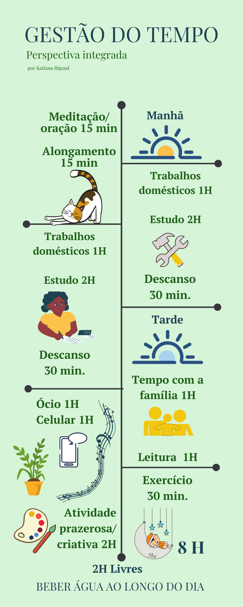 Abaixo seguem duas simulações de gestão do tempo, uma mais voltada para estudantes e outra para pessoas que estão trabalhando em casa, lembrando que cada um pode ser adaptado à própria rotina sem dispensar tempo com bem-estar e saúde: