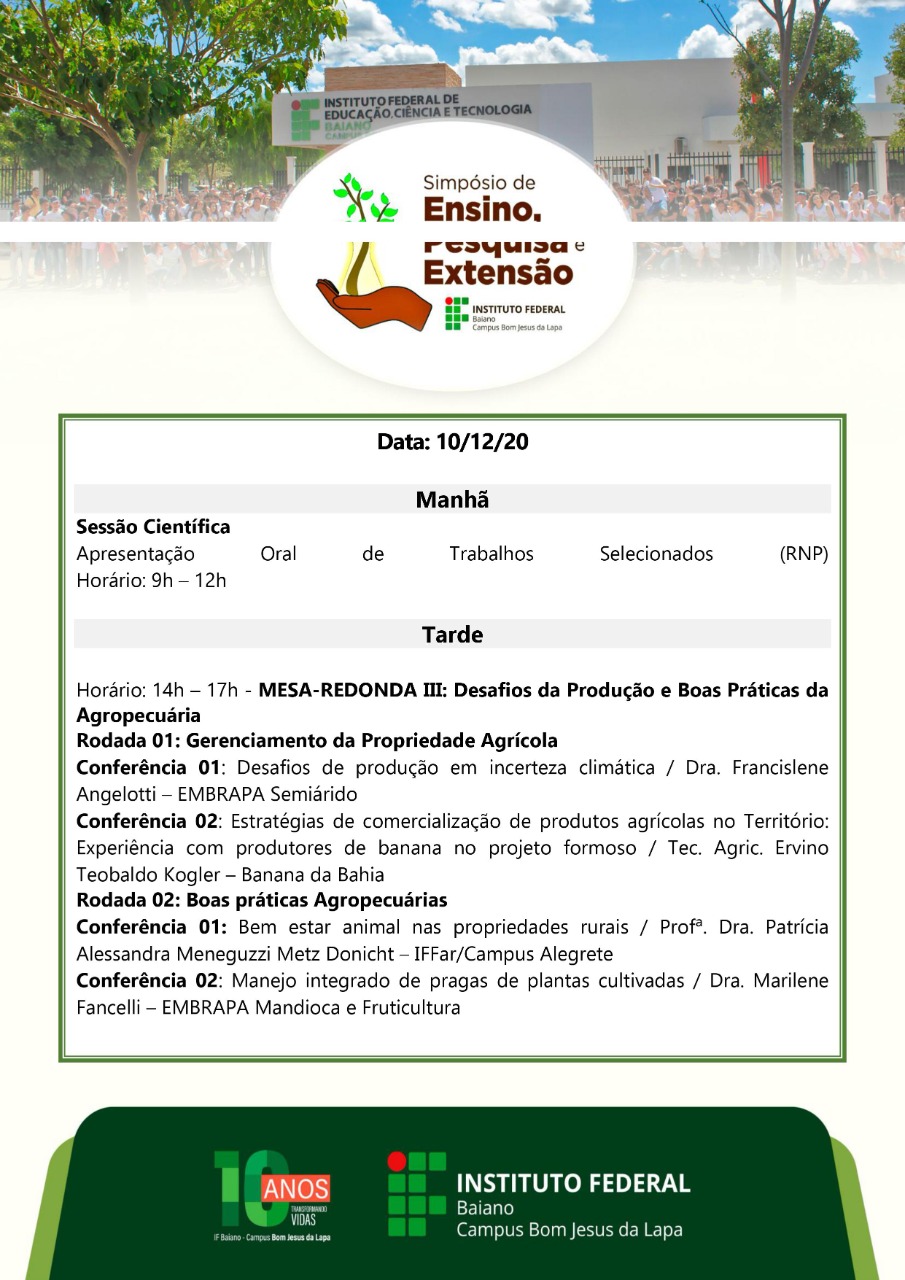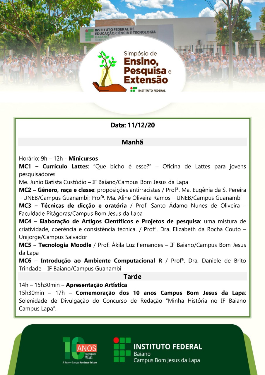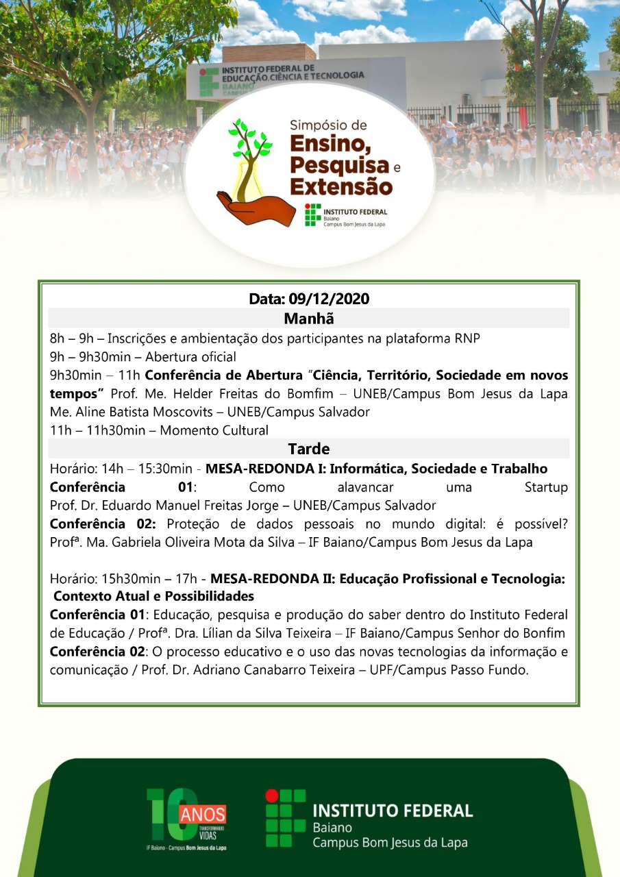 A comissão organizadora do I Simpósio de Ensino, Pesquisa e Extensão do IF Baiano Campus Bom Jesus da Lapa, torna pública a programação do evento.