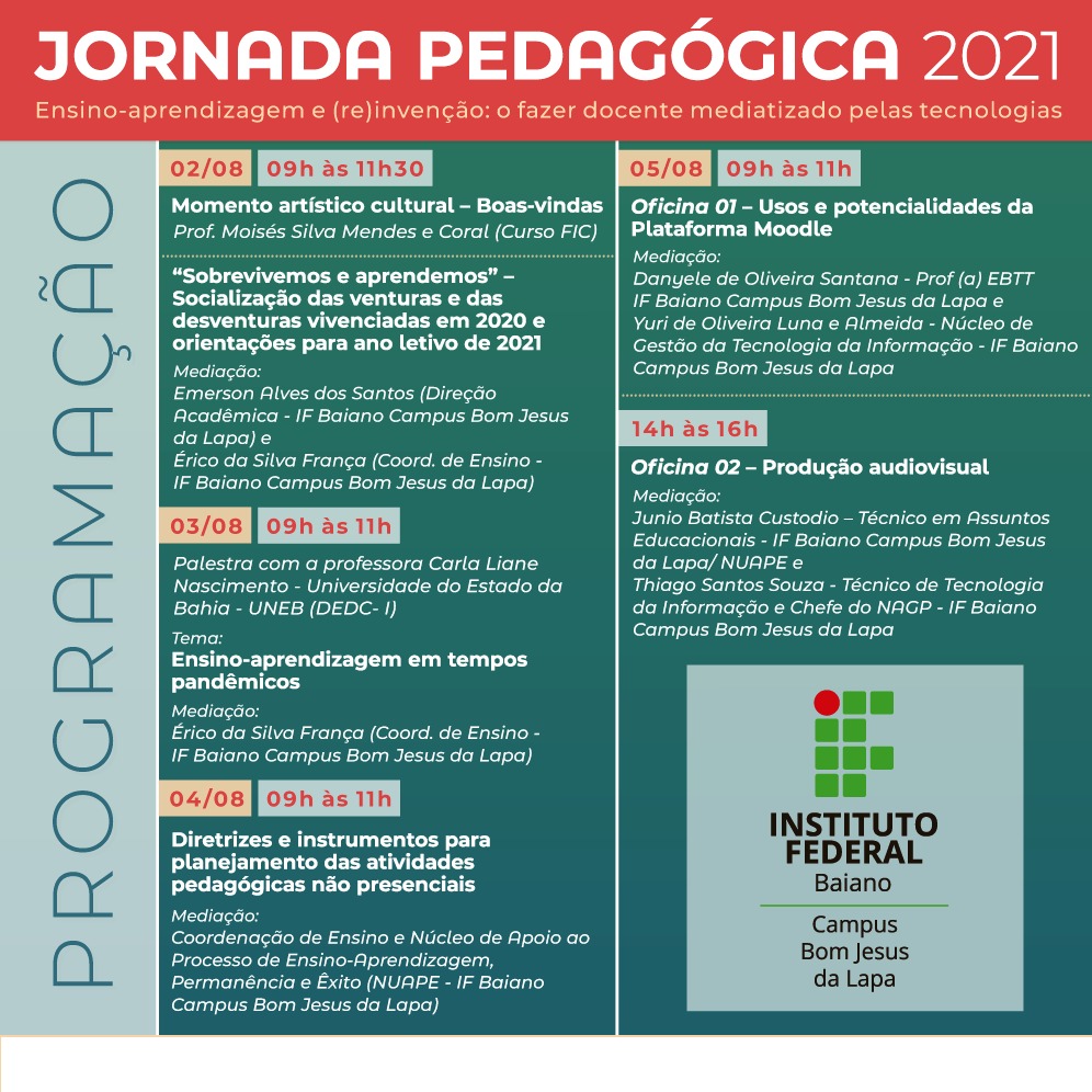 Com o tema: “Ensino-aprendizagem e (re)invenção: o fazer docente mediatizado pelas tecnologias”, O IF Baiano promoverá, entre 02 a 05 de agosto, a Jornada Pedagógica Virtual referente ao ano letivo de 2021. A atividade tem como objetivo proporcionar aos servidores um momento de acolhimento e reflexão, como também um espaço interativo para organização das atividades letivas e de discussão de temas importantes do contexto escolar.