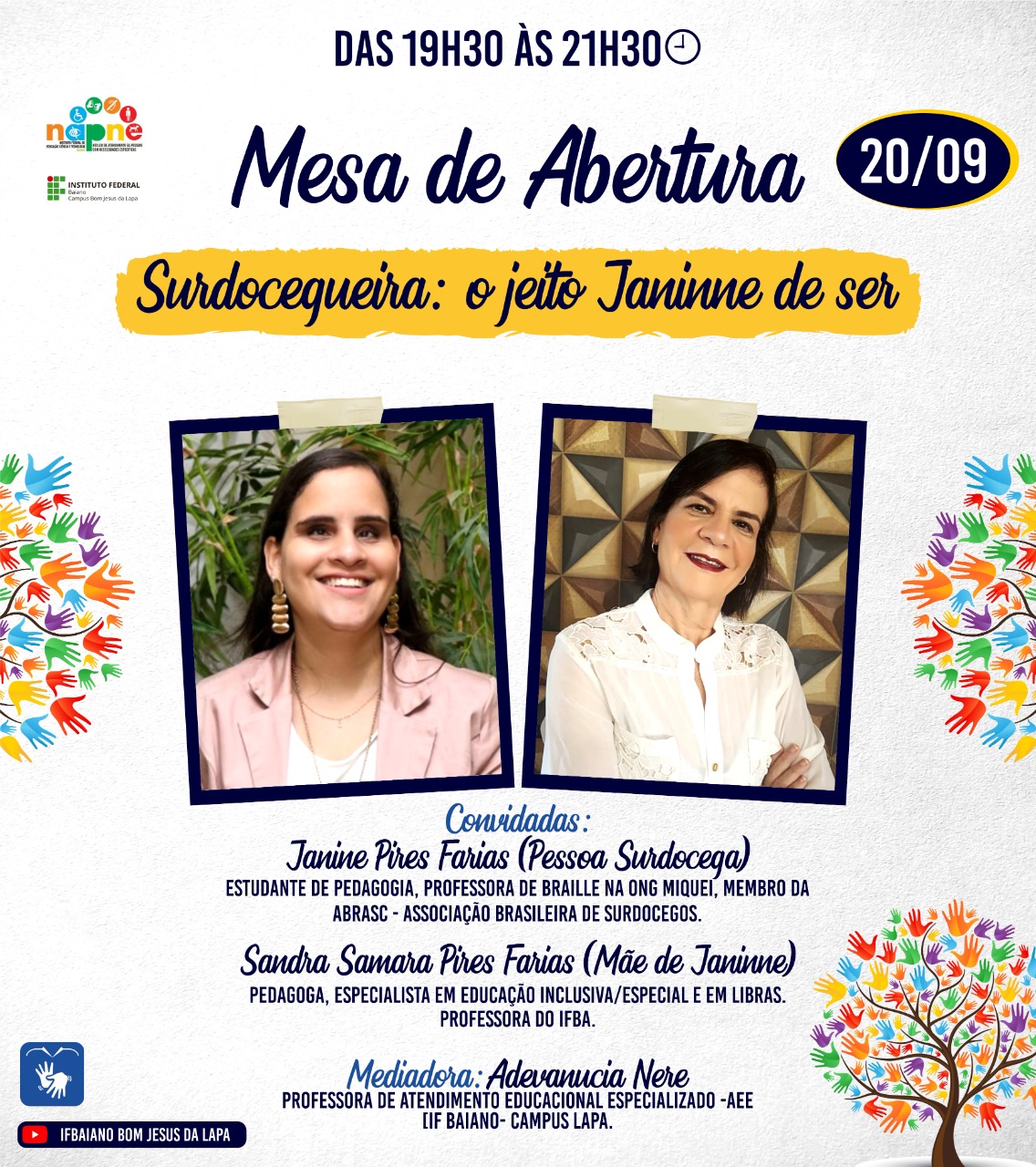 No dia 20/09/21, das 19h30 às 21h30, acontecerá a Mesa de abertura do evento com o tema: SURDOCEGUEIRA: O JEITO JANINNE DE SER. As palestrantes serão Janinne Pires Farias (Pessoa Surdocega), Estudante de pedagogia na UNEB – campus Barreiras, professora de Braille na ONG Miquei, membro da ABRASC– Associação Brasileira de Surdocegos e Sandra Samara Farias (Mãe de Janinne), Pedagoga, Especialista em Educação Inclusiva/Especial em LIBRAS, Professora do IFBA. A transmissão será através do canal no YouTube do IF Baiano – Campus Lapa.