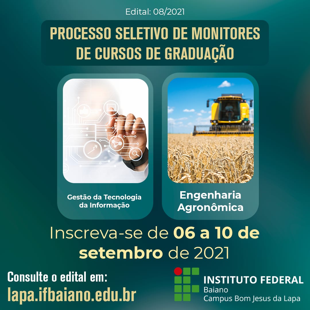 A comissão de monitoria torna público o Edital 08/2021, que estabelece as normas para seleção de monitores de ensino para os Cursos de Graduação em Engenharia Agronômica e Gestão da Tecnologia da Informação, para o semestre letivo 2021.1, em conformidade com a Resolução Consup/IF Baiano n.º 08, de 30 de março de 2016 e Resolução Consup/IF Baiano nº 90, de 28 de outubro de 2020.