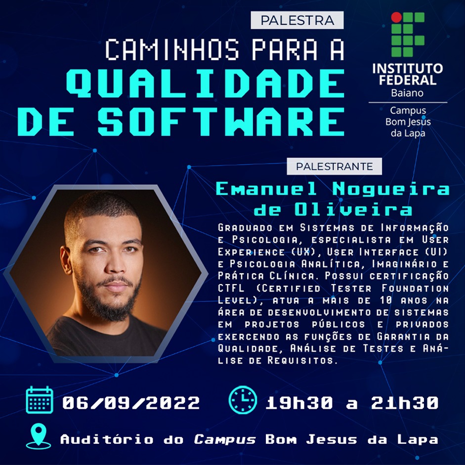 O curso Superior de Tecnologia em Gestão da Tecnologia da Informação, realizará palestra dia 06/09/2022 às 19:30h, intitulada “Caminhos para qualidade software” no auditório do IF Baiano – Campus Bom Jesus da Lapa
