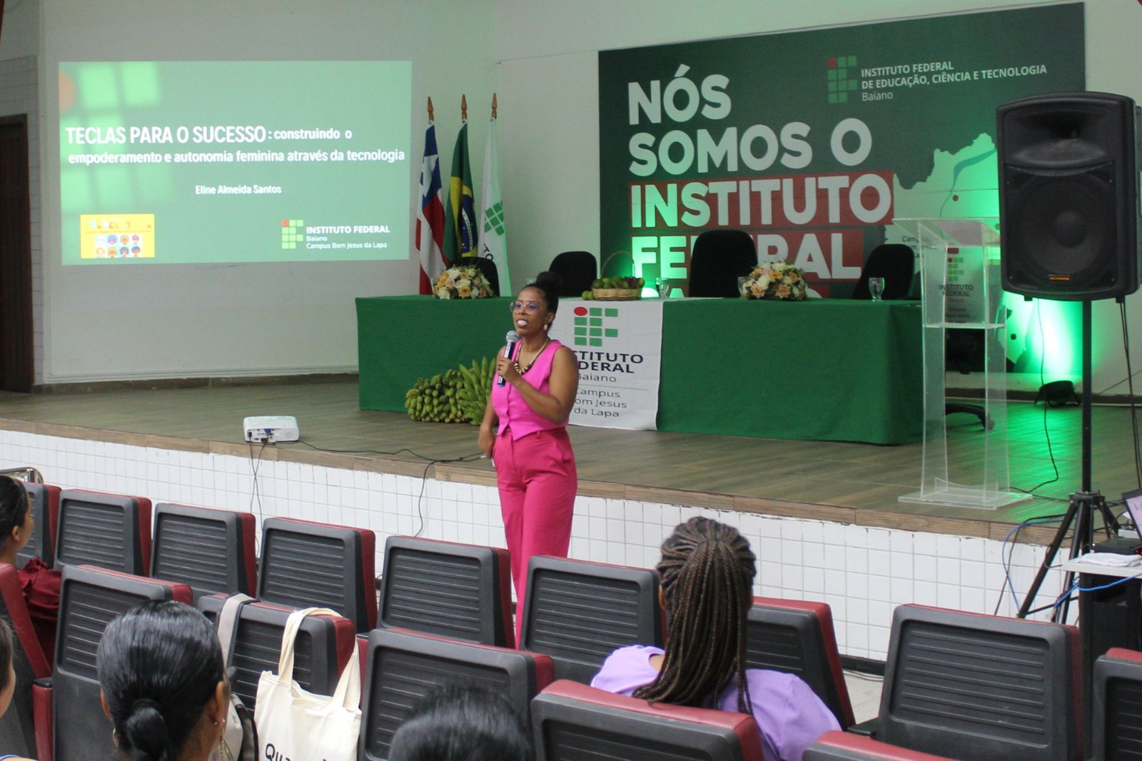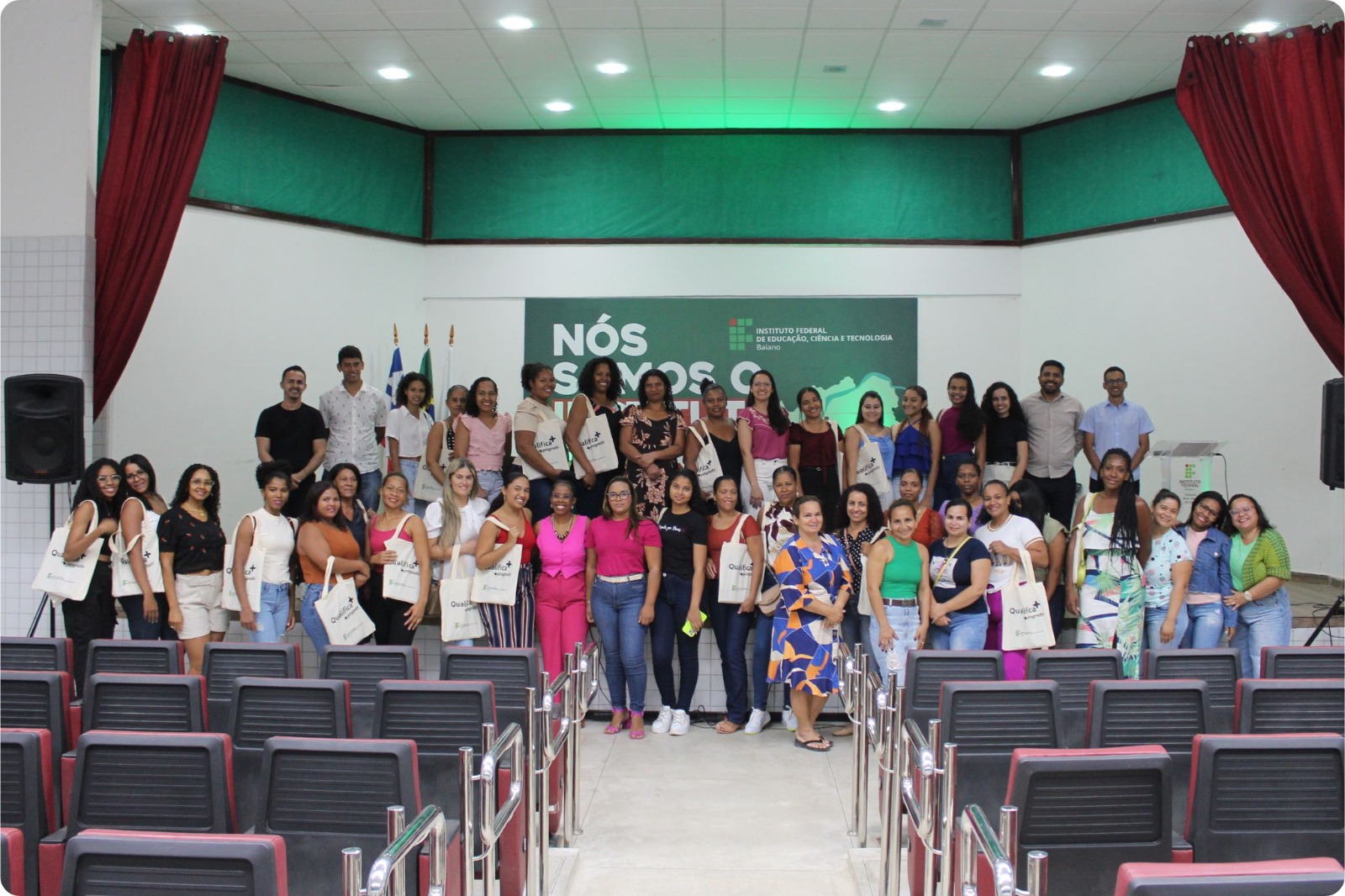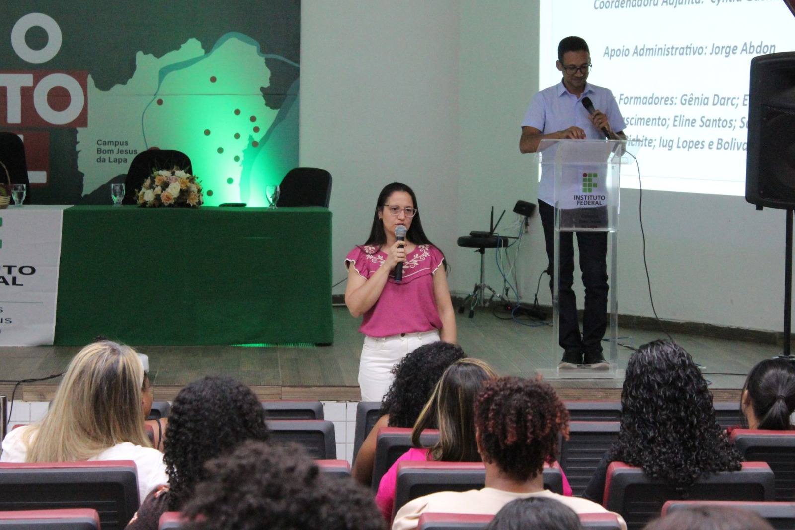 Ontem foi realizada a Aula Inaugural do Curso de Operadora de Computador do Instituto Federal de Educação, Ciência e Tecnologia – Campus Bom Jesus da Lapa. Este curso está vinculado ao Programa Mulheres Mil e faz parte de uma iniciativa que visa a promover a inclusão social e o empoderamento feminino por meio da educação e da capacitação profissional. O Programa Mulheres Mil é um projeto nacional que busca transformar a vida de mulheres em situação de vulnerabilidade social, oferecendo formação educacional e profissional para inseri-las no mercado de trabalho e fortalecer sua autonomia. Alinhado aos princípios de equidade de gênero desenvolvimento social, o programa é uma importante ferramenta de transformação, permitindo que cada uma de vocês alcance novas oportunidades e conquiste novos espaços. O evento contou a presença do Diretor Geral do Campus, Diretora Acadêmica, Coordenador de Extensão, Coordenadora Adjunta do Programa Mulheres Mil, Docentes e Servidores Técnicos Administrativos e do Diretor Geral da UFOB/ Campus Bom Jesus da Lapa.
