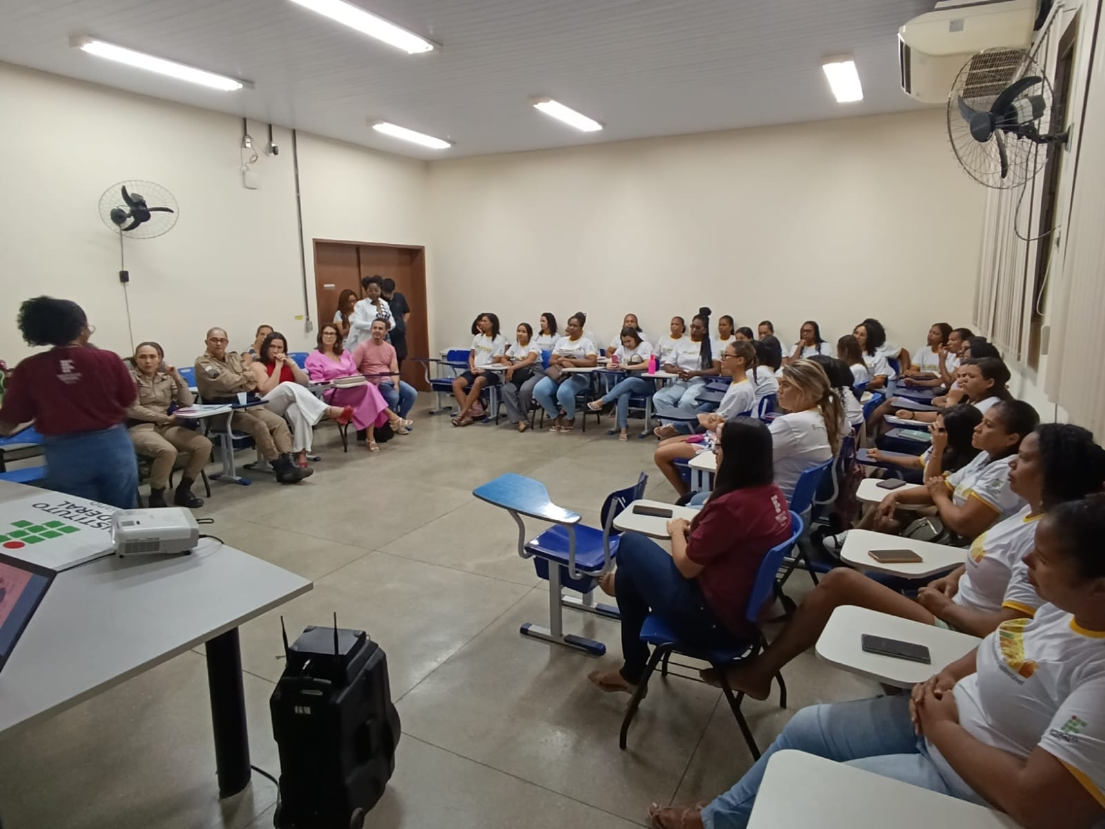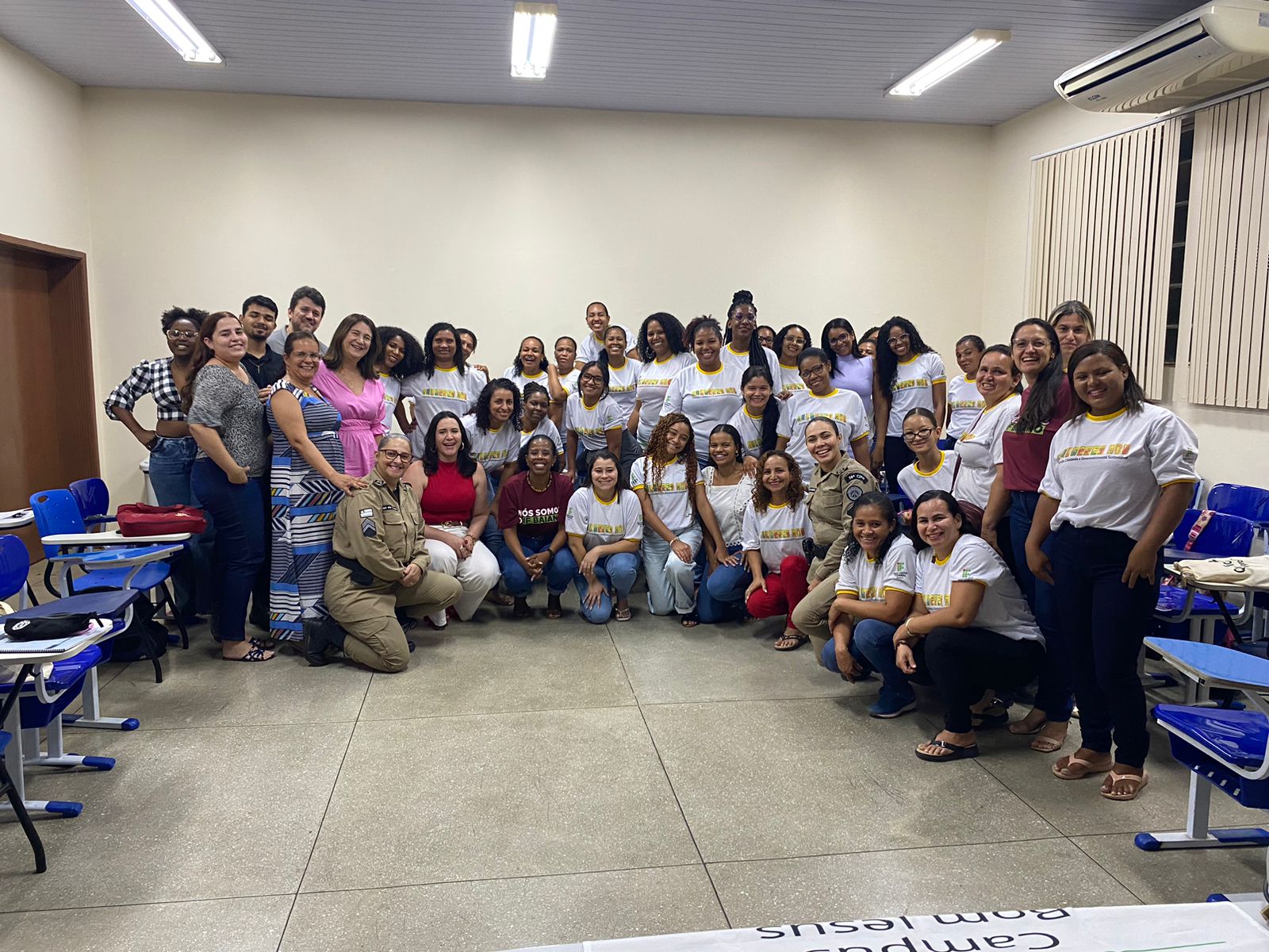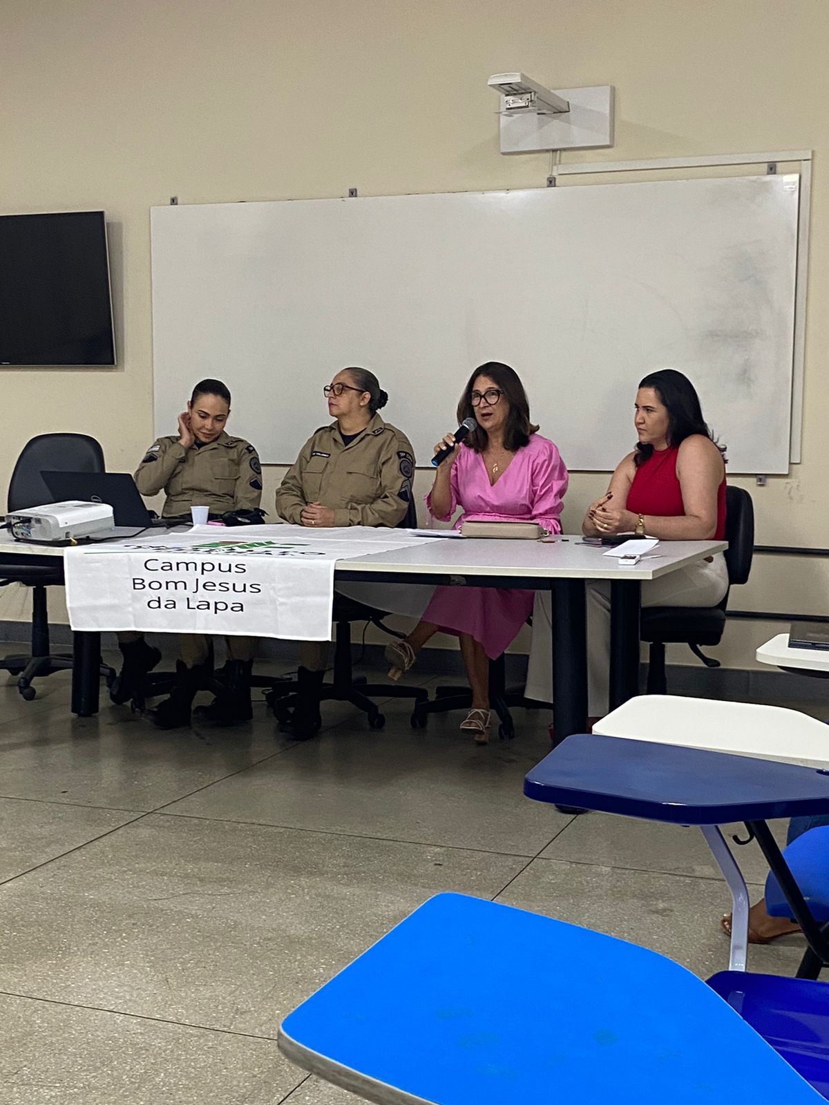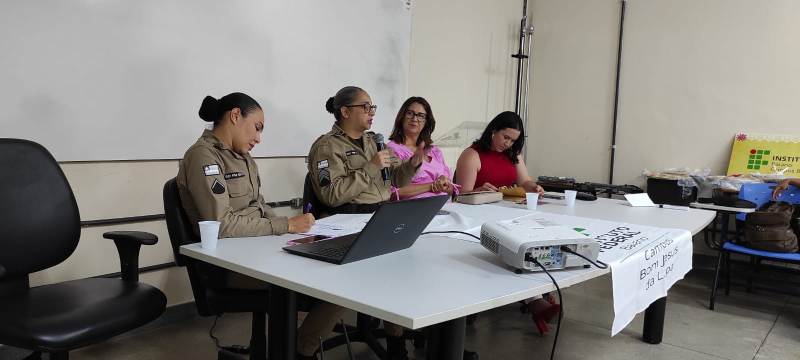 O Campus Bom Jesus da Lapa desenvolve, desde setembro de 2024, o Curso de Operadora de Computador, no âmbito do Programa Mulheres Mil. A proposta é organizada em torno de um núcleo de disciplinas que aborda questões específicas relacionadas à mulher, seus direitos, habilidades e potencialidades, integradas a disciplinas técnicas da área de Informática. No último dia 10 de outubro, no auditório da UFOB, Campus Multidisciplinar de Bom Jesus da Lapa, ocorreu a roda de conversa “Café com Justiça”, evento de encerramento da disciplina Gênero Feminino: A Mulher na História, Cidadania e Direitos da Mulher, ministrada pela professora Eline Santos. A atividade contou com a participação das policiais militares responsáveis pela Ronda Maria da Penha da região de Bom Jesus da Lapa, a 1ª Sargento PM Valdinéia de Oliveira Figueiredo e a Soldado PM Quêiti Conceição Câmara Barbosa, além das advogadas Dra. Sandra Regina Xavier Dourado Silva, presidente da OAB – Subseção de Bom Jesus da Lapa, e Dra. Elvira Santos Pereira, presidente da Comissão da Mulher da referida subseção. O curso faz parte das ações de extensão desenvolvidas pelo IF Baiano – Campus Bom Jesus da Lapa.