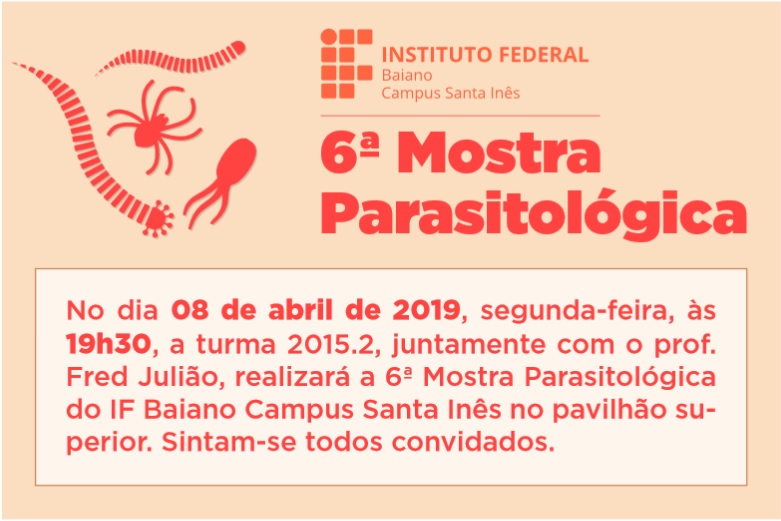 No semestre letivo 2018.2 os alunos do curso de Licenciatura em Ciências Biológicas, matriculados na disciplina Parasitologia, estarão realizando a ”VI MOSTRA PARASITOLÓGICA: Promovendo educação e Saúde”, sob a orientação do Prof. FRED JULIÃO. A atividade consiste na exposição do conteúdo através de pôsteres contendo informações de diferentes parasitos apresentados para estudantes de escolas do Vale do Jiquiriçá. Na sequencia, os alunos são convidados a brincar com atividades que necessite a aplicação do que aprenderam.
