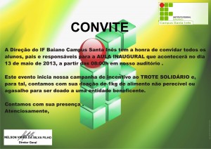 A Direção do IF Baiano Campus Santa Inês tem a honra de convidar todos os alunos, pais e responsáveis para a AULA INAUGURAL que acontecerá no dia 13 de maio de 2013, a partir das 08:00 horas em nosso auditório.