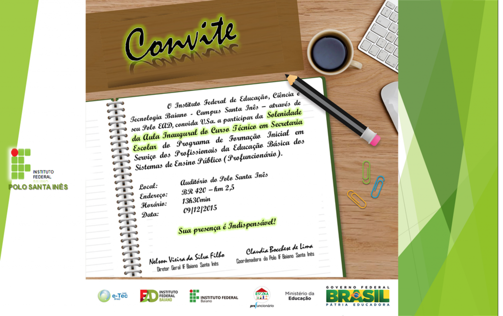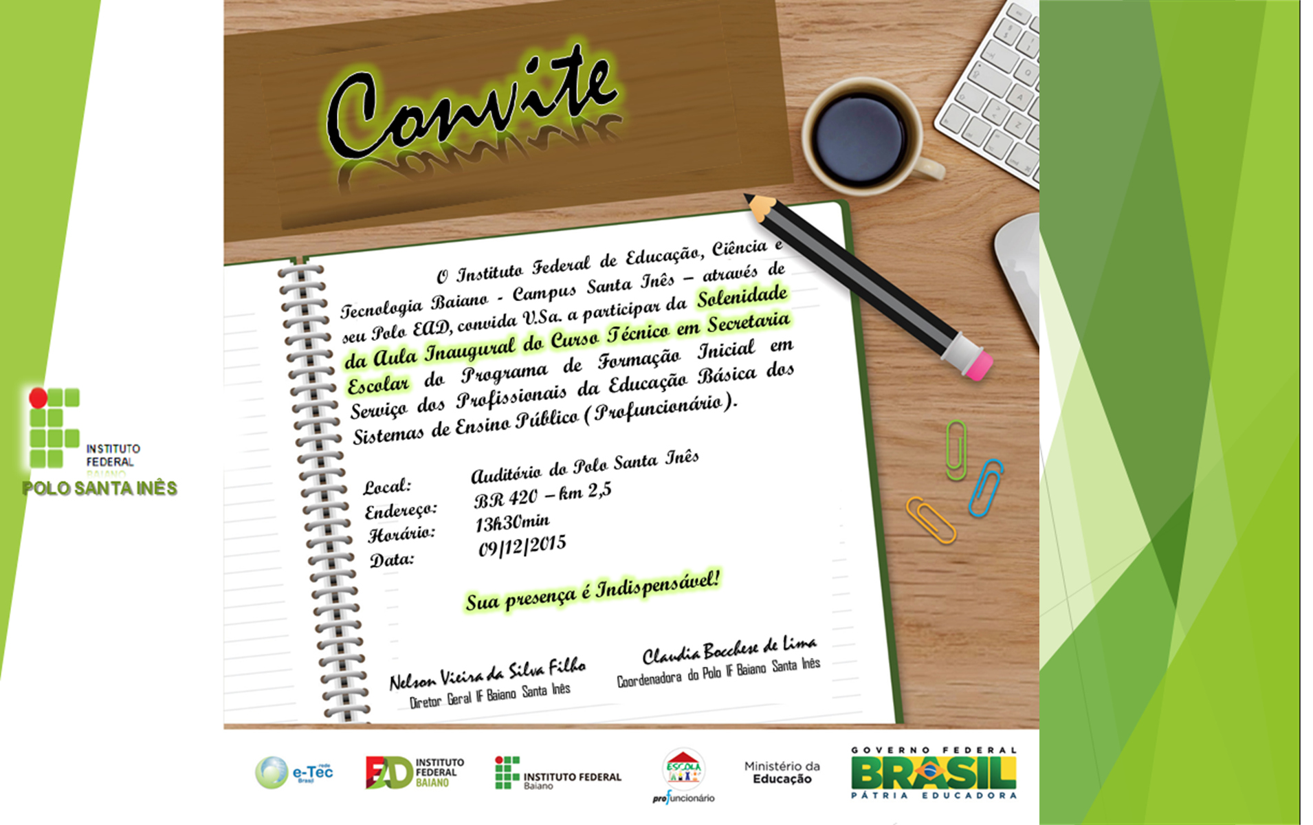 Os alunos matriculados no curso Técnico em Secretaria Escolar dos municípios de Santa Inês, Cravolândia, Laje, Mutuípe, Ubaíra, Maracás e Brejões participarão da Aula Inaugural no dia 09/12/2015 no Auditório do Campus.