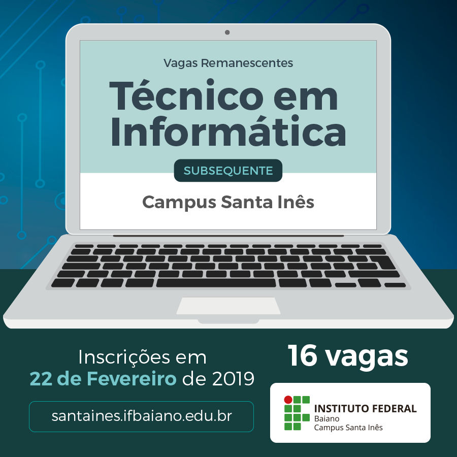 Trata-se do Curso Técnico em Informática na Modalidade SUBSEQUENTE. Esse curso é destinado a candidatos que concluíram o Ensino Médio ou equivalente, possibilitando ao aluno conhecimentos das competências da Educação Técnica Profissional. O curso será gratuito e a seleção para provimento das vagas ocorrerá de acordo com a análise do histórico escolar dos candidatos, respeitando os sistemas de vagas observados pelo IF Baiano.